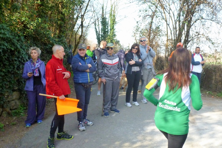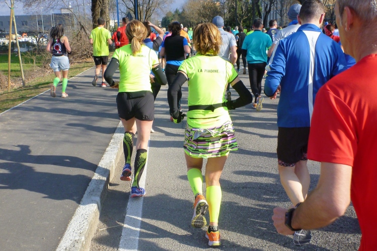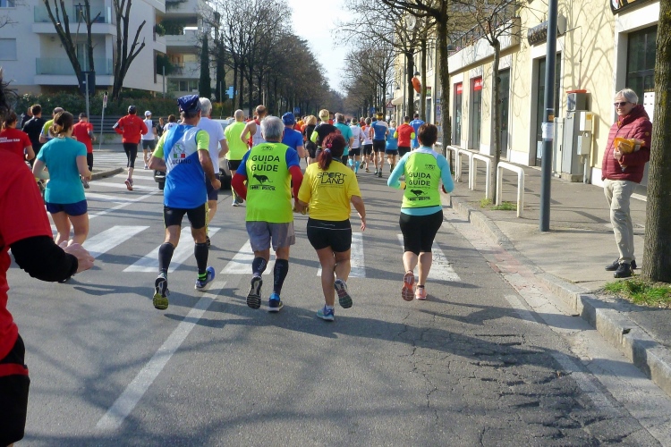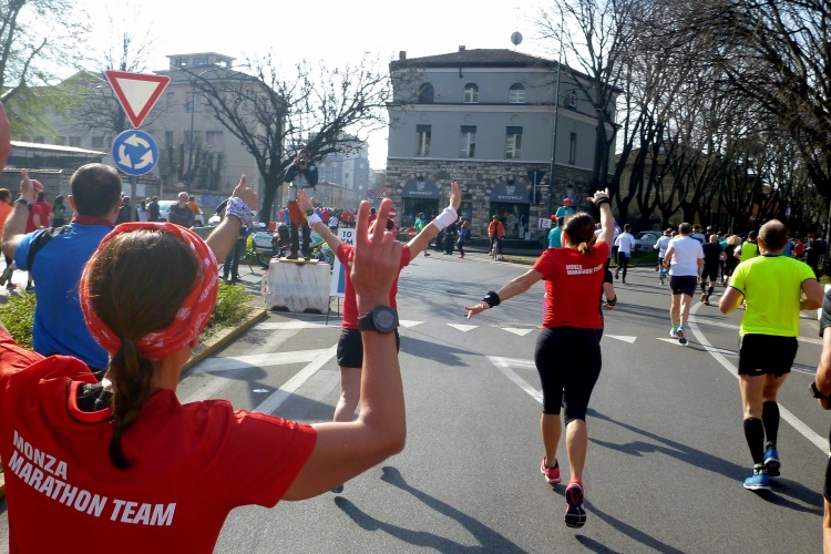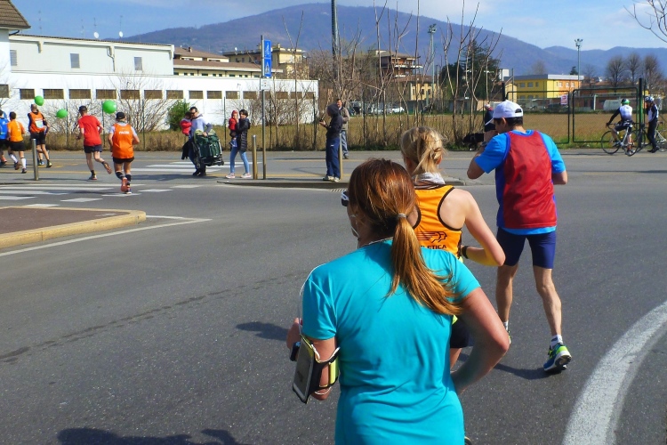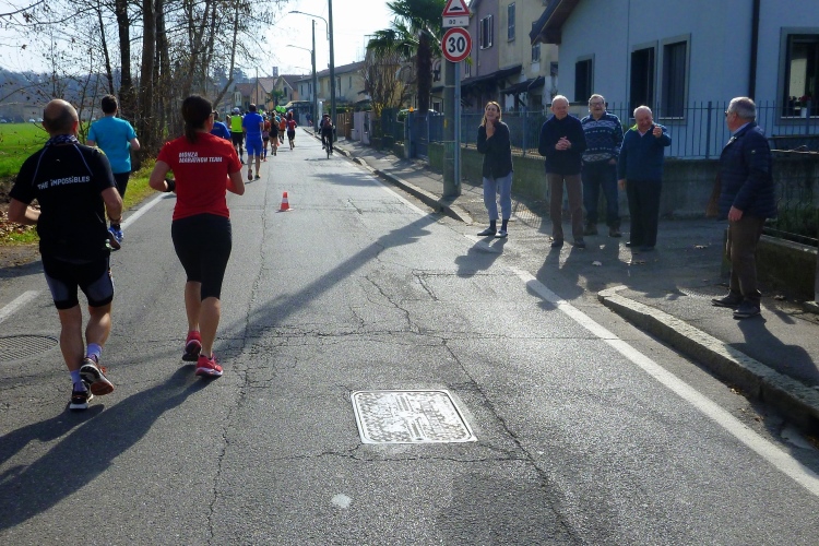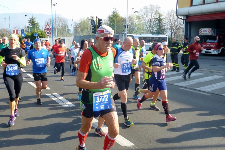 Herbert hat sich schon vor einiger Zeit abgesetzt. Ich habe jetzt Betriebstemperatur und hänge mich an die 4-Stunden-Pacer. Sandro ist der aktivste von ihnen. Er lässt sich oft zurückfallen, um Nachzügler einzusammeln und zu motivieren. Monika hält vorne das Tempo. Der dritte Pacer ist, für Italien ungewohnt, eher von der ruhigen Sorte. Sandro erkennt mich an meiner Actioncam wieder. Er war vor drei Jahren an gleicher Stelle auch mit von der Partie. Wir halten ein Schwätzchen, so gut das geht.
