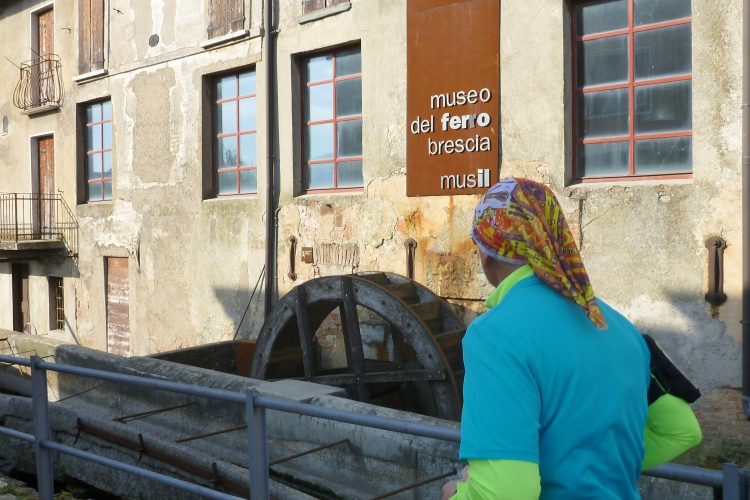 In Caionvico bei km 35 geht es durch einen kleinen Ortskern mit einem spürbaren Auf und Ab. Ich kenne nun viele Mitstreiter, wir überholen uns immer mal wieder gegenseitig. In Sant' Eufemia della Fonte wieder ganz nette Häuschen, aber stimmungsmäßig ist es mau. Highlight für die Autofans ist das rote Tor am rechten Wegrand: In Brescia startet und endet das bekannte Oldtimerrennen Mille Miglia, von 1927 bis 1957 im italienischen Norden durchgeführt und 1977 wiederbelebt. Hier befindet sich das Museum dazu.