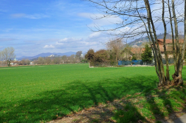 Erste Steigung bei der Überquerung der Tangenziale (Umgehungsstraße). Kurz nach Kilometer 8 wird es dann wunderschön: Vor uns an einem Hügel liegt ein großes Landgut. Ein paar Meter geht es nun sanft bergauf und dann mit Blick auf die Bassa (Ebene) wieder hinunter. Zwischen Feldern und Kleinbetrieben laufen wir gemütlich dahin. Das Villaggio Badia besteht aus vielen kleinen Einfamilienhäusern mit wenig Garten drum herum. Die Chiesa Sant' Antonio di Padova auf dem Hügel lädt inmitten von Weinreben zu Spiritualität und Besinnung ein. Das monströse Anwesen in den Weinterrassen trägt den Namen Cascina Badia Piccola.
