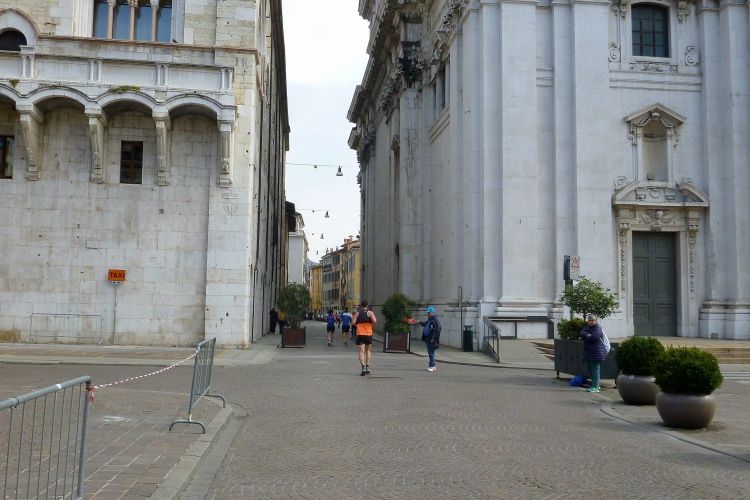 Auf die Läufer wartet jetzt noch eine kleine Schleife über den Corso Zarnadelli mit seinen Häusern samt Laubengängen, wo einige Flaneure unterwegs sind. Wir biegen auf die Piazza della Loggia ein, vor uns das Renaissancegebäude, errichtet 1484 von den Venezianern als Gegenstück zum mittelalterlichem Domplatz. Hinter uns die mittelalterliche Uhr mit den Figuren Macc dè lé ure (die Verrückten der Stunden), die ebensolche schlagen.