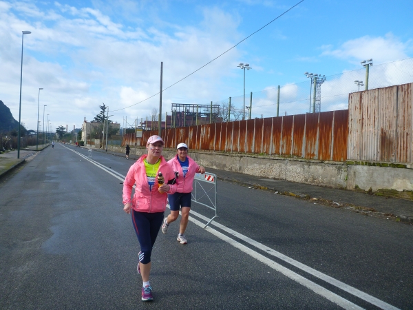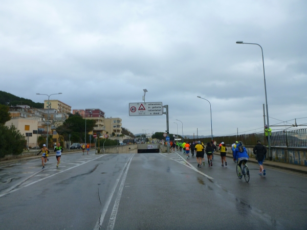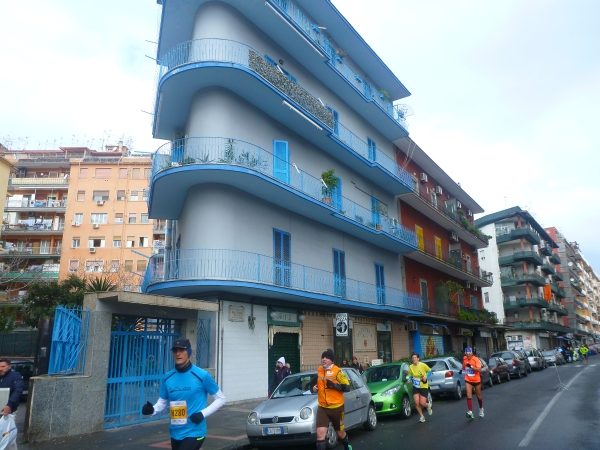 Mir kommen mehr und mehr Läufer entgegen. Auffallend ist ihre Freude, wenn ich sie ablichte. Hinter Km 17 werden die ersten Häuser nach dem Industriegebiet erreicht. Durch eine Häuserschlucht laufen wir bis zum Wendepunkt. Kurz vor dem Wendepunkt laufen wir unterhalb der Metro hindurch. Wir stoßen an die Straße, die wir nach Rückkehr nach Bagnoli in Richtung Neapel laufen werden.