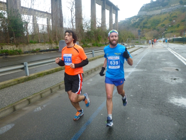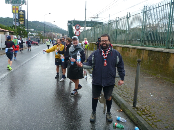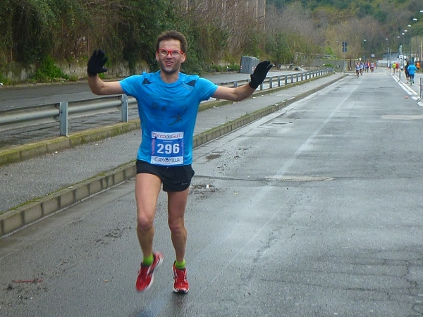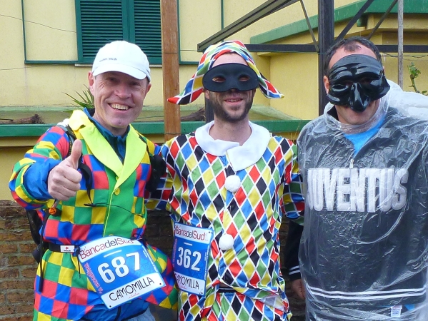 Ich habe ein Karnevalskostüm an. Schließlich haben wir Karnevalsonntag. Aber ich kann nur einen verkleideten Franzosen und einen Läufer mit Gesichtsmaske entdecken. Sonst ist niemand im Läuferfeld verkleidet. Ist wohl nix mit Carnevale in bella Napoli.