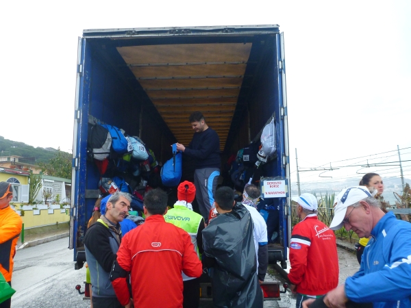 Die Busse kommen und wir werden zum Start etwas außerhalb von Pozzuoli chauffiert. Dort angekommen, verkriechen wir uns ob des bescheidenen Wetters im Warteraum des Bahnhofs und sind so zumindest vor Wind und Regen geschützt.