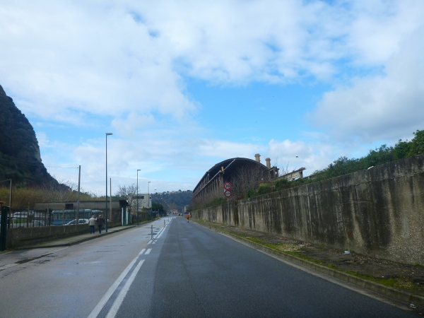 Vor uns liegt der Monte Coroglio. Kurz vor dem markanten Hügel verlassen wir die Via Coroglio und biegen ab nach links in die Via Lombardi. Eine riesige Hallenruine steht links der Mauer. Es geht eine ganze Weile auf der einsamen Via Lombardi mit Blick auf den Monte Coroglio zur Rechten und einem im Verfall begriffenen ehemaligem Stahlwerk entlang. Ein merkwürdiger Streckenabschnitt. Ist schon etwas schräg hier zu laufen. So schräg, dass es bereits wieder etwas hat.