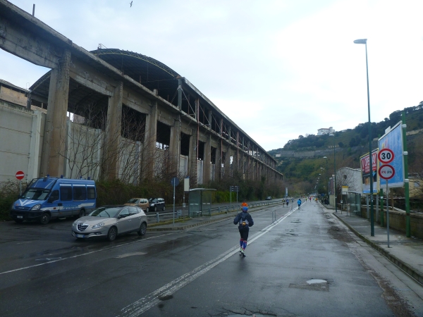 In Bagnoli geht es an der Piazza Bagnoli nach rechts. Läufer kommen uns entgegen. Eine weitere - lange - Schleife liegt vor uns, die Halben laufen nur noch ein Stück mit uns Richtung der Isola di Nisida. Dann wenden sie und laufen zurück. Für uns geht es weiter durch ein Industriegebiet mit Mauern links und rechts der Straße mit vielen Schlaglöchern. 15 Km sind geschafft.