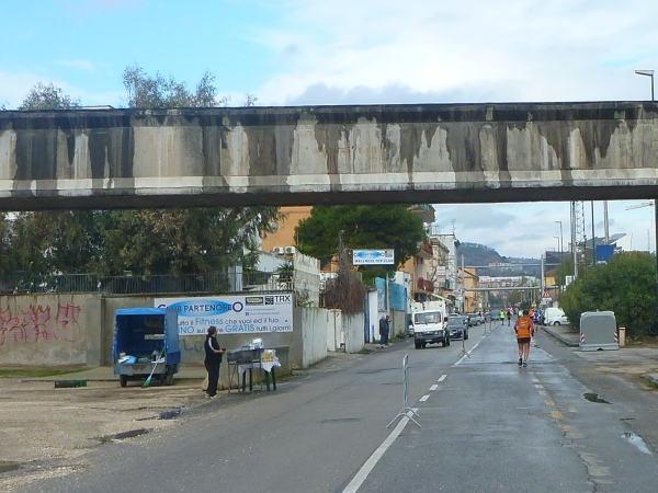 Die Halbmarathonmarke wird überlaufen und wir biegen vor der Isola di Nisida ab Richtung Bagnoli. Obwohl die Gegend sehr verfallen aussieht und man hier keine Arbeitsplätze mehr vermutet, scheint etwas Betrieb zu sein. Ein Mann betreibt am Straßenrand einen kleinen Kocher und wärmt in Alufolie verpackte Essensportionen.