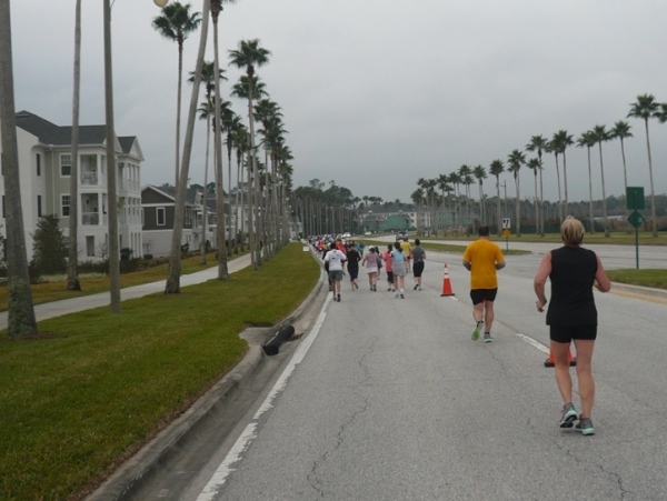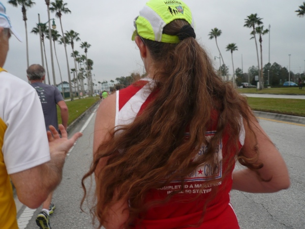 Nun geht es der langen palmengesäumten Straße entlang, vorbei am Krankenhaus und der Feuerwehr. An der nächsten großen Kreuzung die vom Sheriff vom Osceola County für uns Läufer gesperrt wird, geht es in eine weitere lange Straße vorbei am Bürogebäuden und Wohnsiedlungen. Vor mir läuft Beth Davenport, die laut Shirt Mitglied ist im 50 States Marathon Club. Um in diesen Club aufgenommen zu werden, muss man mindestens in 10 US-Staaten gelaufen sein. Im Club sind 3.368 Mitglieder, die schon in allen 50 Staaten einen Marathon absolviert haben.