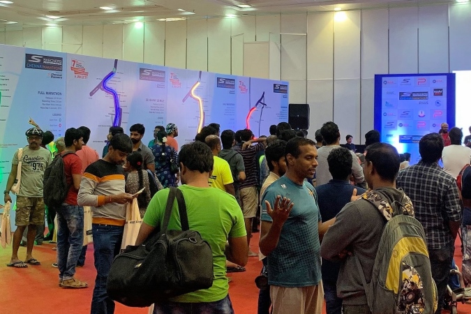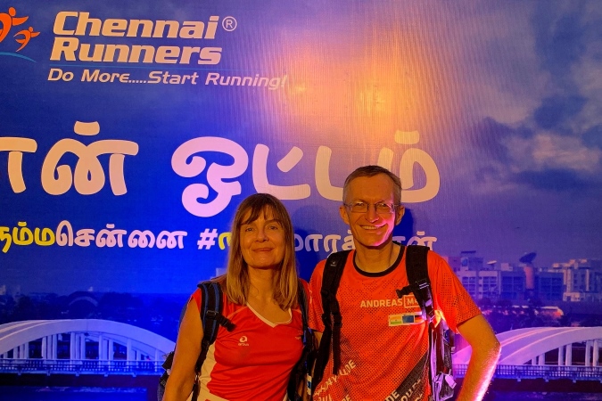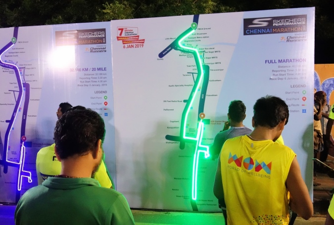 Nach einem kurzen Nickerchen im Hotelzimmer erkunden wir die Gegend um unser Hotel, das im Stadtteil Triplicane liegt. Ein modernes Einkaufszentrum mit Geschäften für jeden Bedarf und zahlreichen Essensständen befindet sich zwar in der Nachbarschaft, ist aber über einen holprigen Gehweg, der gerade renoviert wird, zwischen hupenden Autos und Motorrikschas nur auf abenteuerliche Weise zu erreichen. Den Rest des Tages verbringen wir am Hotelpool und treffen uns am Samstag früh mit meinem indischen Kollegen Ganesh und seiner Frau Mohana, die uns mit dem Auto zur Startnummernausgabe beim Messegelände mitnehmen. Dort verläuft alles zügig und problemlos. In der Gebühr von 15 USD für nicht indische Starter enthalten ist ein neongelbes Funktionsshirt, außerdem der Bustransfer vom Ziel zurück in den Startbereich. Ein Infoheft gibt es leider nicht. Im vergangenen Jahr war ein solches wenigstens im Internet erhältlich. Diesmal, zur siebten Auflage des Marathons, beschränkt man sich darauf, wichtige Informationen, die wir sicherheitshalber fotografieren, auf einer Tafel auf der Marathonmesse zu veröffentlichen. Die offizielle Marathon-Internetseite ist ganz schick, die aktuellsten Nachrichten findet man auf Facebook.