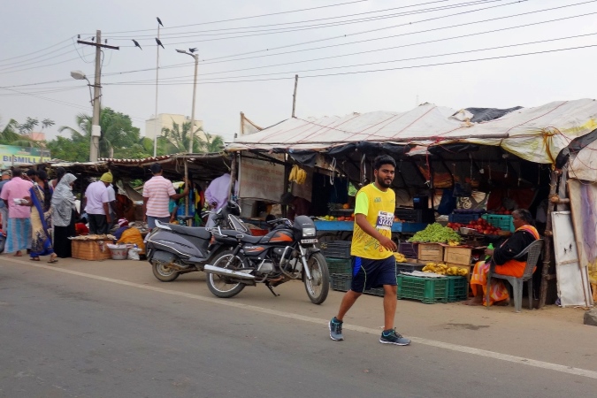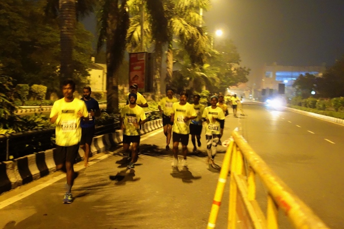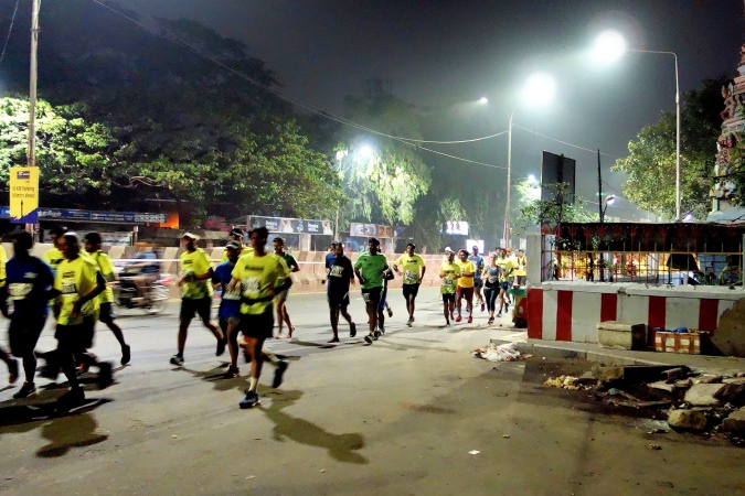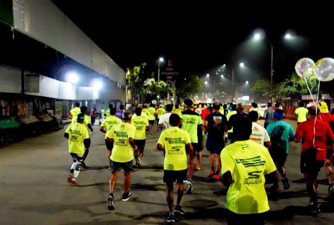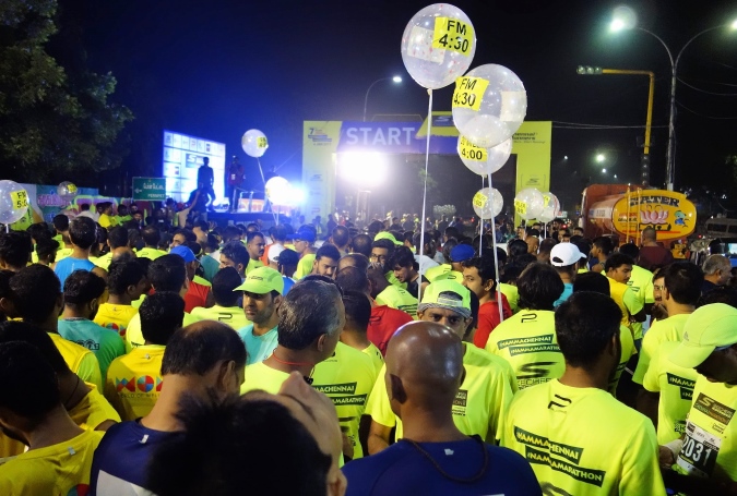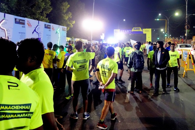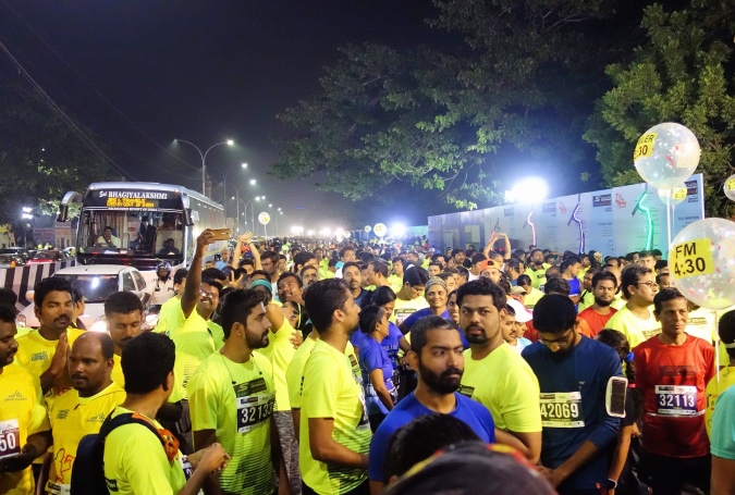 Die Startaufstellung findet auf der breiten Anna Salai statt, einer Hauptverkehrsader der Stadt. Links von uns liegt der Cosmopolitan Club Golf Course. Die Straße ist, wie viele andere auch, durch neue LED-Lampen hell ausgeleuchtet. Um 4:00 Uhr werden die Full Marathonis und die 20- Meiler starten. Erkennbar an den Farben der Startnummer und der Nummer, die entweder mit 42 oder 32 beginnt. Das 32-Kilometer-Rennen, neu im Programm, scheint sich großer Beliebtheit zu erfreuen.