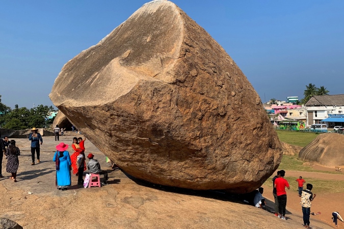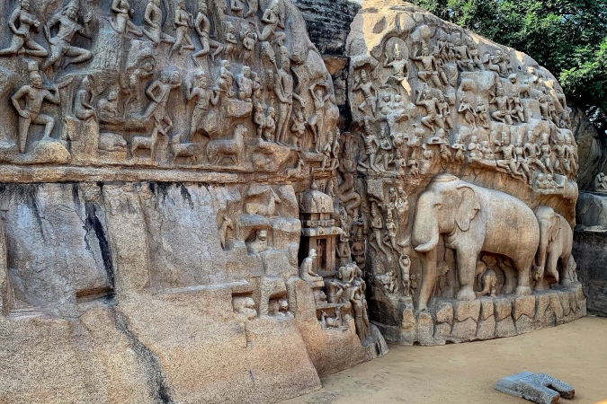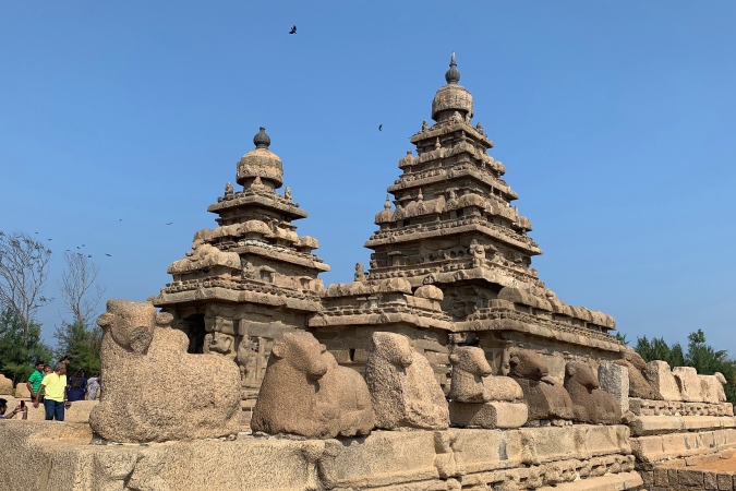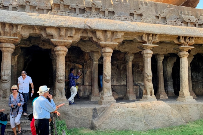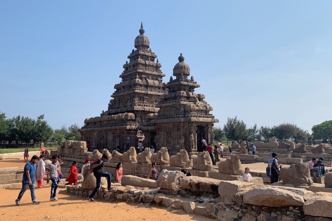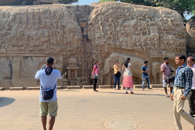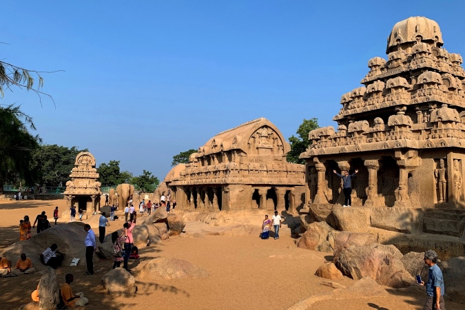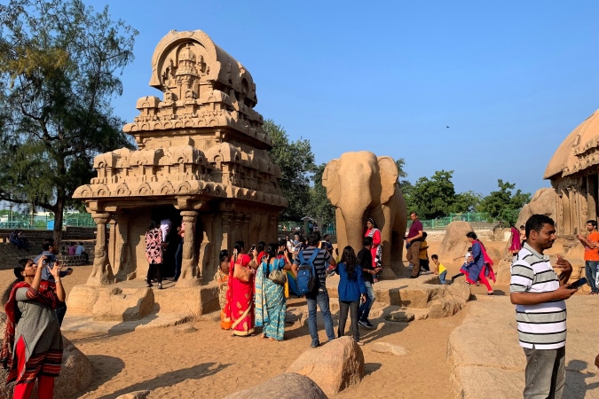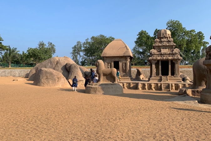 Mit Ganesh und Mohana geht es dann in den Süden nach Mahabalipuram. Ein Stück weit können wir die Marathonstrecke von morgen schon mal in Augenschein nehmen. Die 16.000 Einwohner zählende Stadt, gut 55 km von Chennai entfernt, beherbergt einen der wichtigsten archäologischen Fundorte Südindiens mit zahlreichen Baudenkmälern aus der Pallava-Zeit (7. bis 9. Jahrhundert) und gehört daher zu den wichtigsten touristischen Attraktionen Tamil Nadus. Der Tempelbezirk ist seit 1985 UNESCO-Weltkulturerbe.