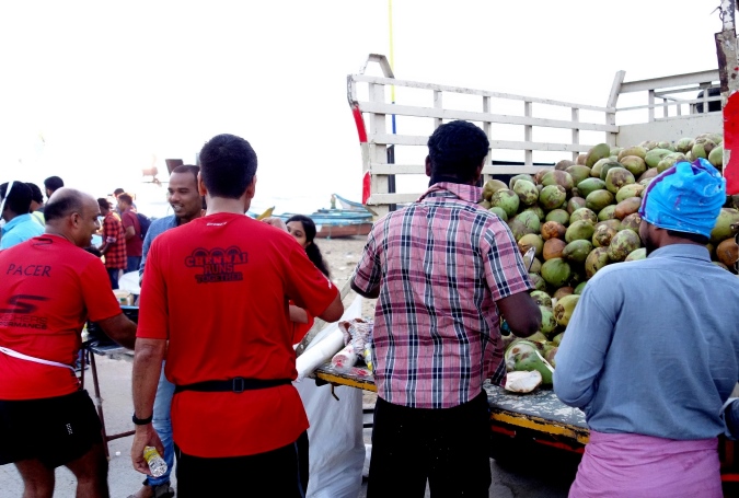 Wir biegen auf eine schmale Straße in ein Villengebiet ein. Grün ist es hier. Unbekannte Vogelstimmen begrüßen den Tag und begleiten uns weiter. Wunderbar. Die Grundstücke sind groß, oft mit etwas älteren Häusern oder mit noblen Neubauten. Wir kommen ans Meer, fast rechtzeitig zum Sonnenaufgang. Links sieht man Fischer bei der Morgentoilette im Meer. Wir umrunden ein Boot direkt am Strand. Ich möchte gar nicht weiterlaufen, so schön ist die Stimmung. An einem Stand gibt es frischen Kokossaft. Dabei werden die grünen Kokosnüsse mit der Machete schwungvoll aufgeschlagen. Das Wasser trinkt man meist mit dem Strohhalm. Danach kann der Verkäufer das weiche Kokosmark von der harten Schale lösen. Schmeckt ganz gut und ist sicher sehr gesund. Am Marina Beach gibt es die Kokosnuss für 20 Rs (0,25 €). Für die Läufer ist der Saft hier natürlich umsonst.