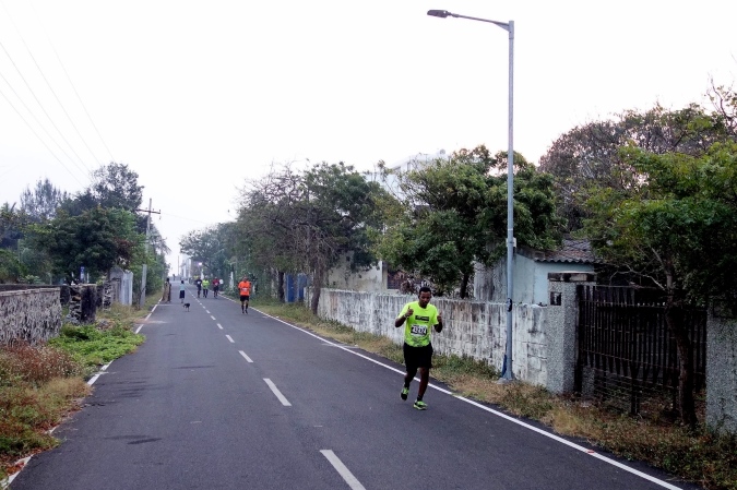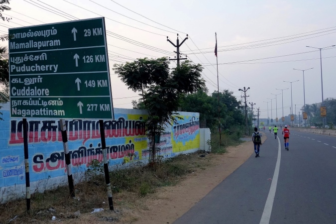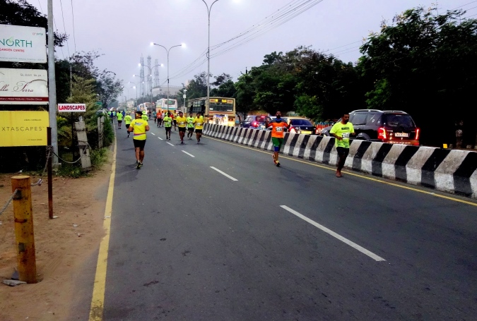 Bei Kilometer 17 verlassen wir die große Straße und biegen nach links ab, eine von mehreren Mautstellen wartet auf uns. Die gut ausgebauten Straßen sind gebührenpflichtig. Die Morgendämmerung beginnt, als wir über den Buckingham-Kanal laufen. Dann geht es auf die East Coast Road, abgekürzt ECR, eine Lebensader am Indischen Ozean. Kurz vor dem Ziel der Halbmarathonis wenden wir zusammen mit den 20-Meilern und begeben uns auf den Weg nach Süden.