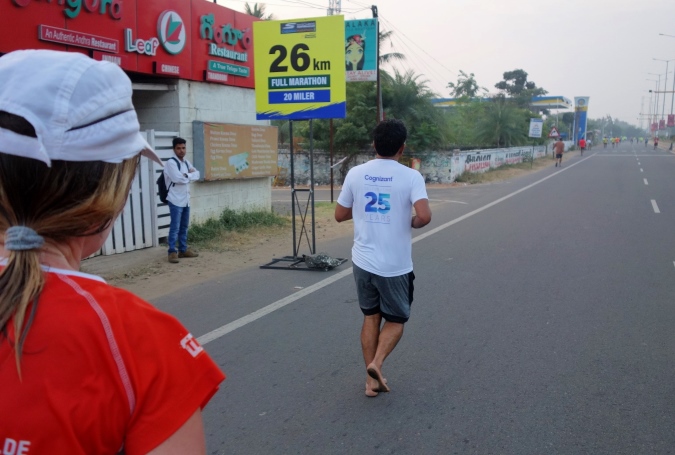 Die 20-Meiler wenden, für uns wird es etwas einsamer. Also noch 2,5 Kilometer hin und wieder zurück. Die Anzahl nicht indischer Läufer liegt sicher nur bei 5-10. Immer mehr Teilnehmer sind nun auch barfuß unterwegs. Viele sind schon ohne Schuhe gestartet, nun kommen noch unzählige Umsteiger hinzu, die ihre Schuhe ausgezogen haben und in der Hand tragen. Auch die drittplatzierte Frau des Full Marathons war barfuß unterwegs.