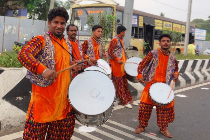 Ein Rechtsknick bringt uns vorbei an einem unbeleuchteten Tempel und an einer Statue für einen Politiker auf die Ausfallstraße Rajeev Gandhi Salai. Eine Trommelgruppe erzeugt ohrenbetäubenden Lärm. Neben uns ein riesiger Betonklotz, ein Bahnhof der S-Bahn. Viele dieser aufgeständerten Metro- und S-Bahnlinien durchziehen die Stadt. Züge sieht man komischerweise selten. Anscheinend werden sie nur in der „rush hour“ benutzt. Bemerkenswert, wie dieser Bahnhof neu gestrichen wurde: Auf das Abkleben der kleinen Fenster hat man verzichtet. Die sind halt jetzt halb undurchsichtig. Hinter dem Gebäude fließt der Westkanal, ein alter Kanal, auf dem man sicher schöne Bootstouren anbieten könnte. Bei einem unserer Spaziergänge haben wir dort nur einfache Hütten und viele Kühen gesehen.