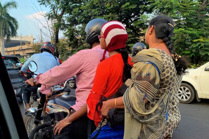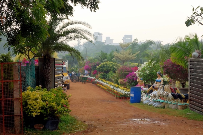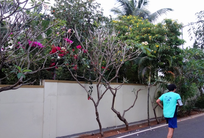 Platz zum Laufen haben wir genug. Unsere Seite der Straße hat mindestens drei Spuren. Sie heißt IT Corridor. Der noch geringe Verkehr wird über die Gegenseite abgewickelt. Wie oft in Chennai sind die Fahrbahnbarrieren sehr hoch. So wird verhindert, dass Fußgänger die Straße überqueren, was meines Erachtens sowieso ein Himmelfahrtskommando wäre. Subways, also Unterführungen, gibt es wenige, es bleibt nur der Weg zur nächsten Kreuzung oder man bleibt halt auf seiner Seite. Insgesamt ist der Verkehr ein Erlebnis. Für die 16 km vom Hotel ins Büro benötigt mein Fahrer 45-75 Minuten. Da wird jede Lücke genutzt, mal nach vorne zu kommen. Auch wenn man dann ganz links steht und nach rechts abbiegen will. Dazwischen die vielen Mopeds und meist Jugendliche auf Fahrrädern. Da müssen eigentlich unendlich viele Unfälle passieren. Querende Fußgänger werden nicht überfahren, aber man zeigt ihnen durch knappstes Auffahren, dass sie besser zu Hause geblieben wären. Fußwege gibt es auch nicht wirklich. Wenn doch, werden sie für Verkaufsstände genutzt. Die Lust zum Flanieren vergeht dann schnell.