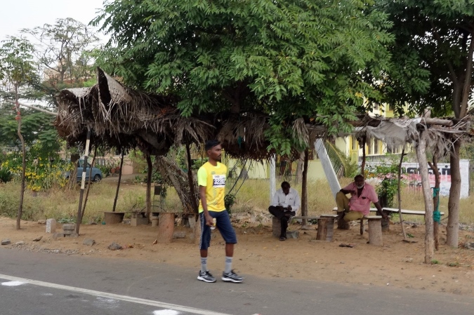 Vor uns liegt ein Fischerdörfchen. Einer der Bewohner putzt sich während des Zusehens an der Laufstrecke die Zähne, einige Frauen kommen aus dem nahen Gebüsch. Ein paar Hunde treiben sich herum. Die vielen Hunde in Chennai haben übrigens eine Mordsangst vor Menschen. Oft soll es Stockhiebe setzen. Aber irgendwie gehören sie dazu und bekommen auch etwas zu essen ab. Katzen gibt es viel weniger, obwohl sie eher gehätschelt werden. Von unserem Hotelzimmer aus habe ich in der Dämmerung auch viele Fledermäuse gesehen. Tagsüber sind neben Tauben und Krähen auch Greifvögel unterwegs.