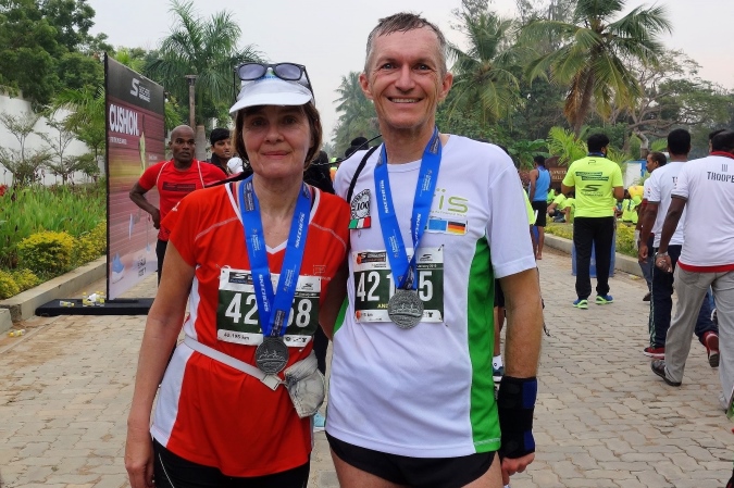 Auf dem Freigelände des großen Golden Beach Resorts erwartet uns ein gut gewürztes indisches Frühstück mit Wasser. Kaffee gibt es keinen mehr. Viele indische Läufer wollen Selfies mit uns machen. Nach der Prämierung der Sieger erhält der 74-jährige Schweizer Otto, in Chennai wohl „Wiederholungstäter“, eine besondere Ehrung. Mit 4:28 Stunden war er knapp vor uns im Ziel.