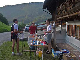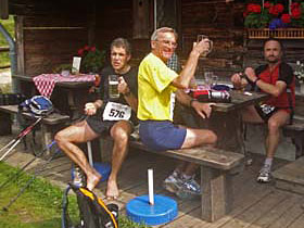 Da kommt die nächste Alm gerade richtig. Sebastian sitzt schon beim Bier und ich leiste ihm bei einem Radler Gesellschaft. Gerade jetzt kommen von der 100-Kilometer-Fraktion Werner Selch und Wolfgang Jezek vorbei und so ist im Nu ein fröhliches Gelage im Gange. Die Wanderer am Nebentisch zucken jedes Mal zusammen, wenn ich eine der Blasen aufschneide, am meisten zucken sie aber, als wir erzählen, dass wir noch gut 60 Kilometer vor uns haben. Unser Lauf würde bei ihnen wohl für eine ganze Wanderwoche ausreichen.