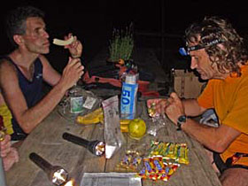 Für die meisten Teilnehmer war allerdings die Streckenmarkierung in der Nacht das größte Fragezeichen. Deshalb hatten sich verschiedene Teilnehmer verabredet, um die nächtliche Streckensuche gemeinsam zu versuchen. Da dieses Abenteuer kein Wettkampf sein sollte, war die individuelle Startzeit (ab 16 Uhr) freigestellt. Letztendlich starteten aber doch 9 der 12 Teilnehmer gemeinsam um 16.30 Uhr. Nur der Organisator der Veranstaltung musste erst noch bei der Pasta-Party die 100er begrüßen und machte sich gegen 19 Uhr auf die Verfolgung. Zwei weitere Läufer sind wohl noch am späteren Abend gestartet, waren aber bei allen Verpflegungs- und Kontrollstellen außerhalb des Zeitrahmens und auch 12 Stunden nach Ablauf des Zeitlimits noch nicht im Ziel, so dass man nur vermuten kann, dass sie einen besonderen Abenteuerlauf absolviert haben.