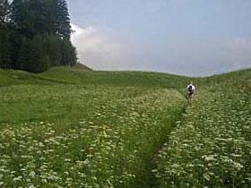 Aber lange Zeit für große Gespräche nehme ich mir nicht. Ich will weiter, bevor ich den Verlockungen von herumstehenden Stühlen und Liegebetten evtl. erliege. Ich bedanke mich nochmals besonders bei Uli für seine Navigationskünste und dann mache ich mich zusammen mit Tom Wolter-Rössler auf den Weg nach Westen. Die 2. Runde wird uns um und vielleicht am Schluss auf den Hochfelln führen. Einen Kilometer nach dem Stadion beginnen die ersten Hügelchen, es folgt ein Direktanstieg über Wiesenhänge und zum guten Schluss wartet der Skihang am Unternbergsattel. Dann sind wir auf einer Laufstrecke von 4,5 km um 650 Meter höher.