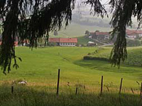 Die Voralpenlandschaft um Maria Eck gefällt mir ausnehmend gut. Viel Wald, sanfte Hügel, schöne Ausblicke hinüber zu den höheren Bergen – es macht trotz allem Spaß hier unterwegs zu sein. In Maria-Eck ist wohl gerade ein Gottesdienst zu Ende und durch die Besuchermengen wühle ich mich über den Parkplatz. Die erste richtige Berührung mit der Zivilisation nach dem Stadion in Ruhpolding heute morgen. Kurz darauf gibt es eine weitere Verpflegungsstelle, an der ich erfahre, dass ich jetzt der letzte Läufer auf der Strecke bin. Alle, die hinter mir lagen, haben aufgehört oder sind in Eschelmoos auf die Abkürzung eingebogen; darunter auch 4 der 100 Meilenläufer.