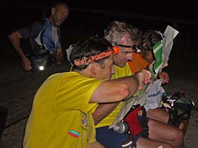 Freunde von Giselher haben ihre Garage zur Verfügung gestellt und einfach das Licht brennen lassen. Verpflegung und Registrierung in den Zwischenzeitlisten erledigen wir selbst. Dabei sehen wir, dass die andere Gruppe so 45 Minuten vor uns durchgekommen ist. Wir nehmen´s einfach zur Kenntnis. Wettkampfgedanken gibt es nicht bei diesem Abenteuer. Als wir die Garage verlassen, merken wir, dass ganz allmählich der Morgen anbricht. Vor lauter Begeisterung produzieren wir den nächsten Verlaufer, da wir einfach weiter der Straße folgen und nicht wie im Roadbook beschrieben, den Sportplatz überqueren.