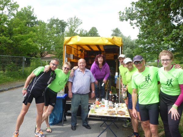 Das feuergelbe Spielmobil hat man dagegen alle 8 Kilometer, es beinhaltet unser Gepäck, Wechselklamotten, auch Fahrräder, falls jemand nicht (mehr) laufen will, denn es steht das entspannte Miteinander im Vordergrund des Wochenendes. Die Verpflegung ist einmalig, es gibt alles außer Mückenmilch, man muss sich nur bedienen lassen. Verpflegungsstation mit Bringservice!