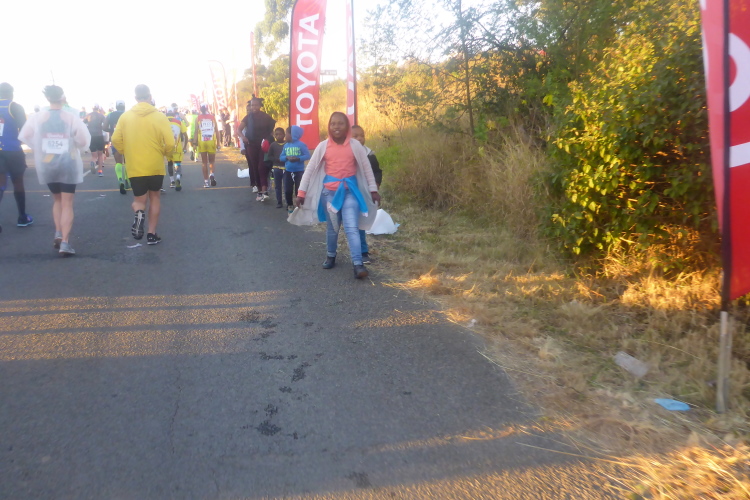 Ein paar Kilometer weiter erreichen wir die Ethembeni School for Handicapped Children. Die Schüler, Lehrer und Betreuer sind seit jeher an der Strecke, um die vorbeikommenden Läufer anzufeuern. Mittlerweile wird der gesamte Etat der Schule durch Spenden von diesem Lauf finanziert. Die meisten Läufer lassen es sich nicht nehmen, die lange Reihe der Kinder abzuklatschen. An der nächsten VP ergattere ich ein paar Kekse. Sie sind so trocken, dass ich einen ganzen Beutel Wasser dazu trinken muss.
