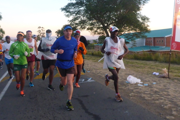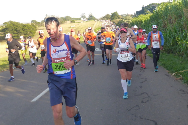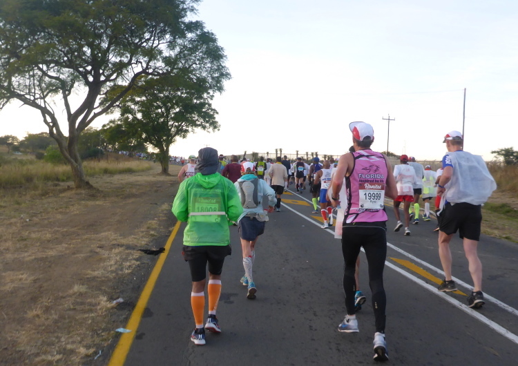 Ich schaffe es unfallfrei und auch um mich herum ist alles im grünen Bereich. Es geht gleich bergab und nach einer scharfen Rechtskurve wieder bergauf. Nach einiger Zeit liegen die letzten Häuser von Pietermaritzburg hinter uns. Hier geht es erneut bergab. Trotz der Dunkelheit kann man schon ganz gut laufen. Wobei man allerdings schlecht überholen kann, da das Feld noch sehr dicht ist. Dieses Jahr stehen Scheinwerfer am Straßenrand und beleuchten die Strecke. Ich überlege, ob das eine gute Idee ist. Sie sind sehr niedrig aufgestellt, blenden sogar, und man kann eigentlich nicht wirklich mehr sehen.