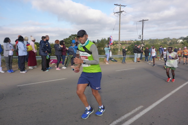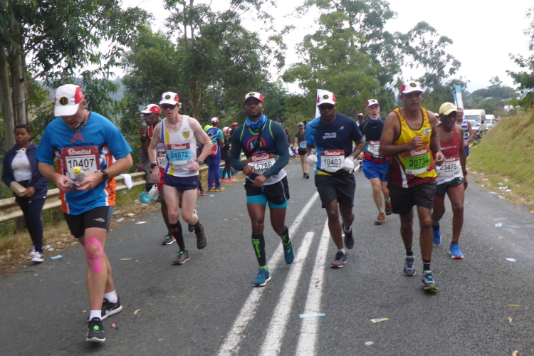 Bei km 50 schenken Angehörige des „Area Military Health Unit KZN“ Wasser und Cola aus. Es sind Mitarbeiter des südafrikanischen Militärs, die im Sanitätsdienst arbeiten. Wir werden persönlich angesprochen und motiviert. inzwischen habe ich trotz Salztabletten Krämpfe abwechselnd im einen, dann im anderen Oberschenkel. Vielleicht zu wenig getrunken, vielleicht zu schnell gelaufen. Helfer und Zuschauer haben große Salzstreuer und geben Salz auf Obst oder einfach auf die Hand. Kurzzeitig werden die Krämpfe besser; jetzt bloß nicht stehen bleiben.