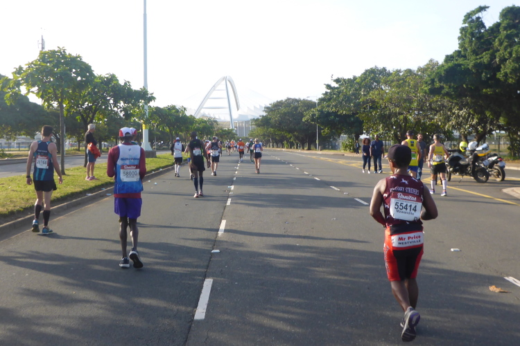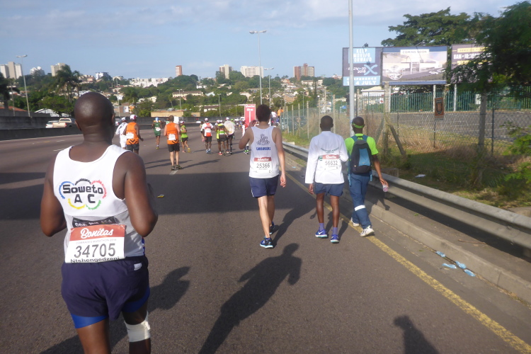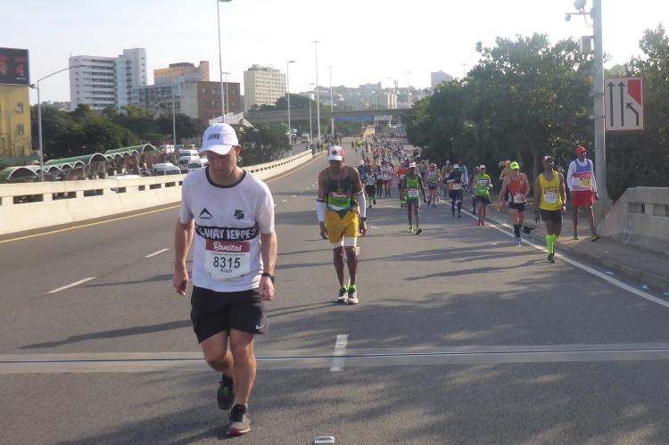 Noch 12 km, noch 11 km, dann noch 10 km. Die Gegend wir immer städtischer. Ist hier schon die Autobahn? Die dreispurige Straße ist voll mit Läufern. Es wird noch einmal spannend, der letzte Cutoff bei km 81 steht an. Es geht ziemlich lange bergauf. Dann laufe ich über die Zeitmessmatte: 20 Minuten Luft, das ist super. Die nun folgende längere Steigung schaffe ich mit abwechselndem Gehen und Laufen. In der Ferne sind die ersten Hochhäuser Durbans zu erahnen. Langgezogen ist das nächste Gefälle und anschließend geht es nochmals bergauf. Auf der schönen Bogenbrücke, von wo aus man den tollen Blick auf die Skyline von Durban genießen kann, stehen viele Zuschauer, die uns von oben herab anfeuern.