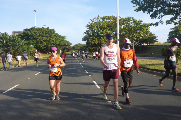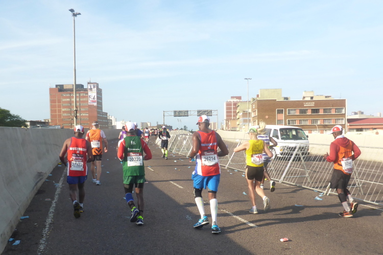 Unter lautem Jubel laufen wir unter der Brücke durch und haben die City von Durban zu unseren Füßen. Es dämmert schon und die Hochhäuser in der Ferne scheinen im letzten Sonnenlicht zu baden. Gebannt laufen wir dem Ziel entgegen. Auf der Autobahn geht es bergab. An der nächsten VP ist das Wasser ausgegangen. Enttäuscht laufen wir weiter. Ich hatte gerade ein Gel geschluckt, und etwas Wasser wäre willkommen. Aber die nächste VP ist ja nicht weit.