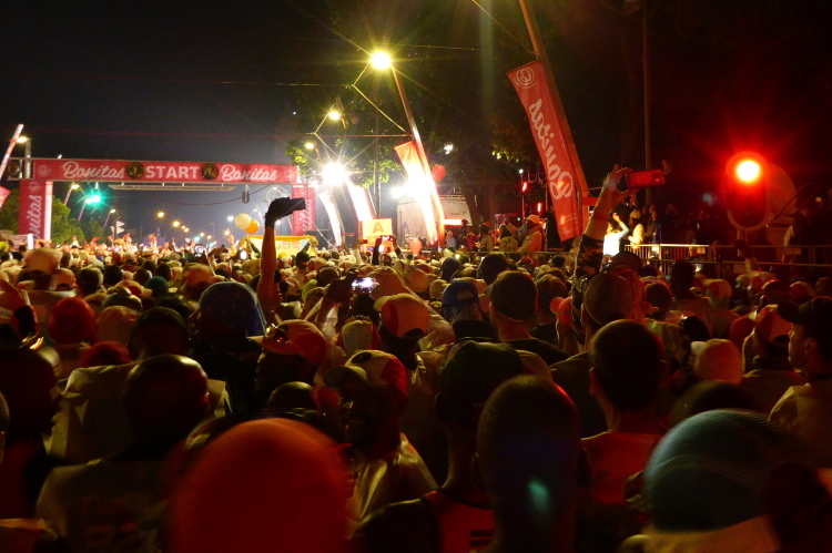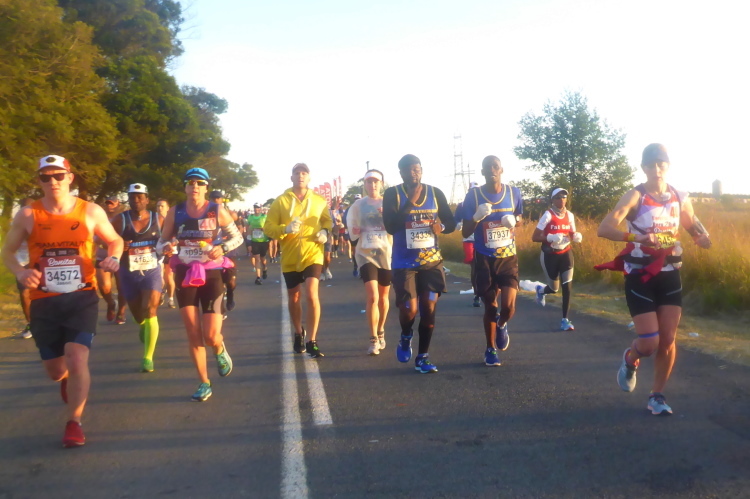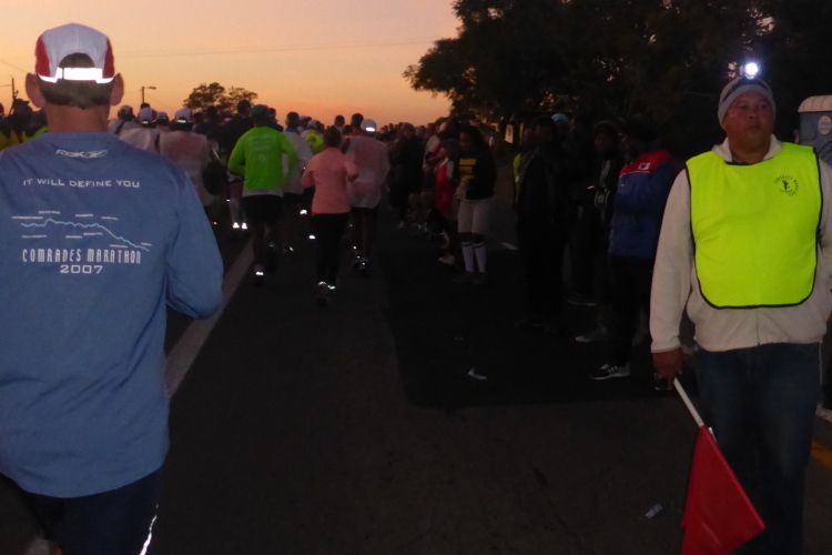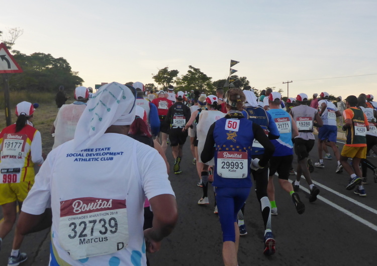 Dicht an dicht stehen die Läufer und harren der Dinge; Spannung liegt in der Luft. Wie überall bei großen Sportveranstaltungen ertönt laute Musik und ein Sprecher unterhält die Menge. Obwohl ich den Ablauf bereits kenne, bin ich immer noch genauso berührt, wie beim ersten Mal: Es wird gespenstisch still, dann beginnt die Menge die Nationalhymne von Südafrika anzustimmen. Mittlerweile kenne ich ein paar Zeilen und kann zumindest den Refrain mitsingen. Lauter Jubel reißt mich aus meiner Andacht. Das Arbeiterlied Shosholoza wird traditionell als Wechselgesang intoniert. Einer singt vor, und die Menge antwortet. Die Luft scheint vom vielstimmigen Gesang zu vibrieren. Ein deutsches Pärchen hinter mir ist sich einig: „Deshalb sind wir hier“. Tosender Jubel wird vom grandiosen Song von Vangelis „Chariots of Fire“ unterbrochen. Um 5 Uhr 30 ertönt der legendäre zweimalige Hahnenschrei, direkt gefolgt vom Startschuss und dann unter dem donnerndem Applaus der vielen Zuschauer und lauten Anfeuerungsrufen des Moderators geht es los.