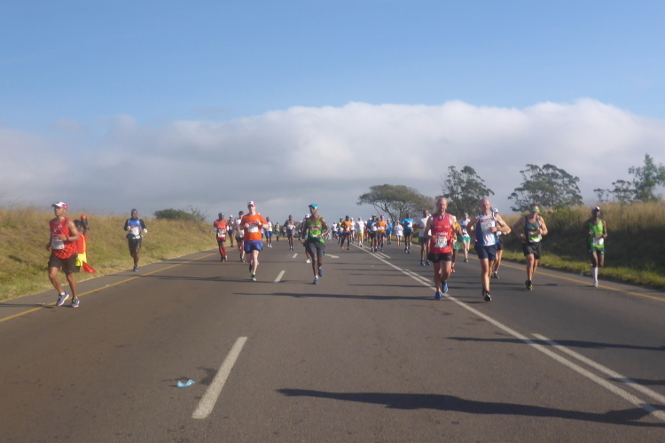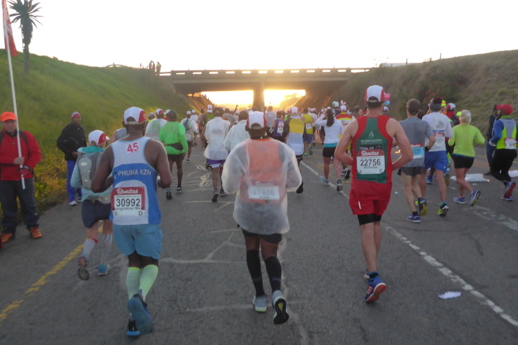 Am Laufmorgen müssen wir früh aufstehen. Um 2 Uhr gibt es Frühstück und um 3 Uhr fährt der Bus unserer Reisegruppe von Durban zum Start nach Pietermaritzburg. Dieses Jahr herrscht extremer Verkehr. Erst um 4 Uhr 45, also 45 Minuten vor dem Start sind wir Vorort. Noch schnell ein Dixi aufgesucht, und schon muss man zu seinem Startblock, um 5 Uhr 15 werden die Tore geschlossen.