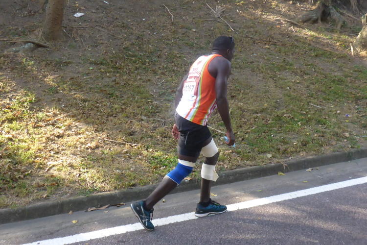 Hinter einer weiteren Brücke ist die Strecke neu. Es geht ja in diesem Jahr nicht ins Kricket Stadion, sondern etwas weiter ins Mohses Mahbida Stadion. Die VP bei km 86 hat noch genügend Wasser. Meine Krämpfe werden allerdings jetzt schlimmer, so dass ich regelmäßige Gehpausen machen muss. Bei km 88 ist es mir aber klar: ich könnte die letzten 2 Kilometer langsam gehen und wäre trotzdem rechtzeitig im Ziel. Man kann das riesige Stadion mit seinem 105 m hohen Bogen nämlich schon deutlich sehen.