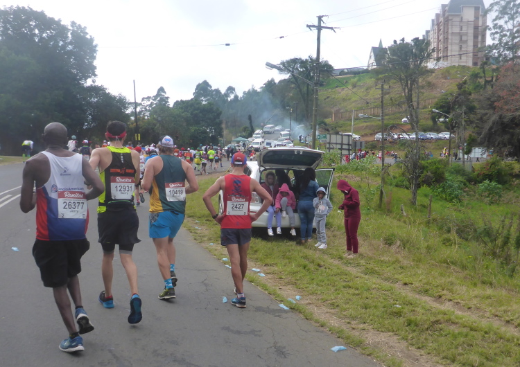 Die erste Verpflegungsstelle bei km 4 lasse ich aus. Langsam wird es heller. Um Viertel vor sieben geht die Sonne auf und taucht die Landschaft in oranges Licht. Immer wieder stehen zu dieser frühen Stunde Schaulustige am Straßenrand, oft noch im Bademantel oder Schlafanzug. Sie singen und klatschen. Um sieben Uhr ist es endgültig hell und wir haben bereits elf Kilometer geschafft. Ich genieße die Landschaft und freue mich hier zu sein. Fast lückenlos stehen Zuschauer vereinzelt oder in Gruppen an der Strecke. Jeder feuert uns an. Viele hoffen auf Kleidungstücke, die von den Läufern am Straßenrand zurückgelassen werden. Ich habe extra eine ältere Laufjacke dabei, die mir lange Jahre treue Dienste geleistet hat. Nun bekommt sie hier einen neuen Besitzer.
