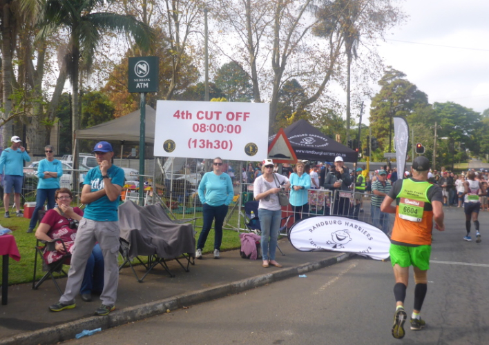 Bei Cato Ridge, es sind noch 60 km zu laufen, geht es richtig ab: der nächste Cutoff steht an. Zunächst passieren wir ein Schild auf dem der Cutoff in einem Kilometer Entfernung mit 9:50 Uhr angekündigt wird. Dadurch angespornt, wird das Feld gleich einen Schritt schneller. Obwohl es hier bergauf geht, bin ich bereits um 9 Uhr 20 durch.