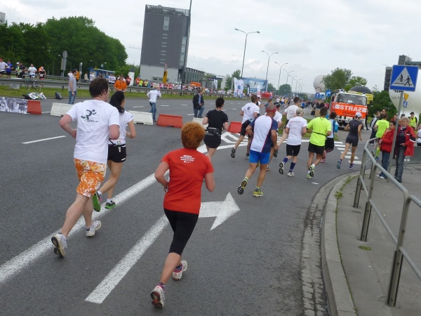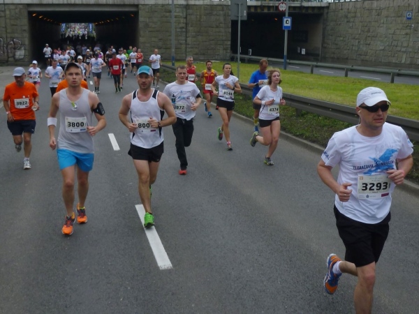 Der Hauptsponsor Bank Polski PKO hatte an die Zuschauer Vuvuzela-artige Blasinstrumente ausgegeben, die einen Höllenlärm verursachen und die einem mächtig Dampf machen. Auf der Startliste hatte ich noch ein weiteres Pärchen aus Monachium (München) gefunden. Dass die jetzt an mir vorbeilaufen, hätte ich mir ja denken können: „Team Erdinger Alkoholfrei“ hat hier nicht jeder auf dem Hemd stehen. Als ich die beiden ansprechen will, sind sie schon entschwunden.