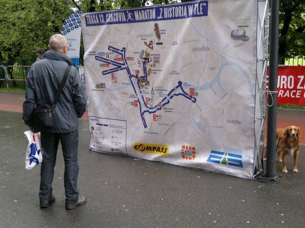 Auf dem in der moderaten Startgebühr enthaltenen Funktionsshirt ist natürlich auch ein Drache abgebildet, außerdem ein Zitat von Johannes Paul II: „Musicie od siebie wymagać, nawet gdyby inni od was nie wymagali“. Ich dachte, der sportliche Papst hätte etwas zum Marathon gesagt. Die automatischen Übersetzungen im Internet lassen das allerdings nicht vermuten. Vielleicht findet sich ein Leser, der dieses Zitat übersetzen kann. Das ist ein gewisses Manko des Marathons: Die fast  nur in Polnisch verfügbaren Informationen. Lediglich die wichtigsten Infos gibt es im Internet auf Englisch und die Starterbroschüre ist zweisprachig gehalten, alles Weitere, auch der Newsletter, ist komplett polnisch. Ach ja, im Preis wäre auch ein Gesundheitscheck inklusive EKG von der medizinischen Fakultät enthalten gewesen.