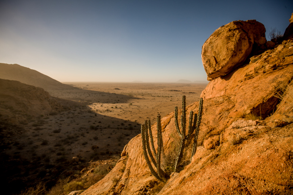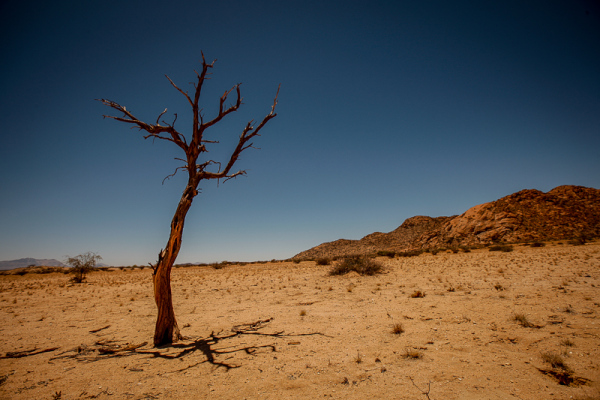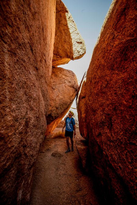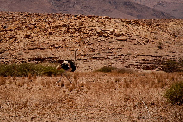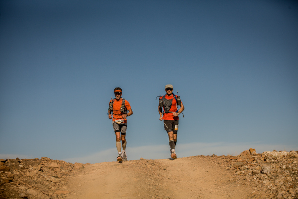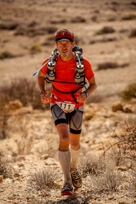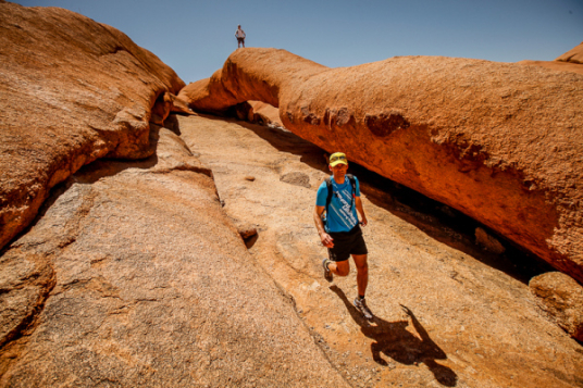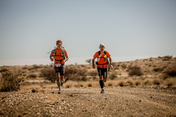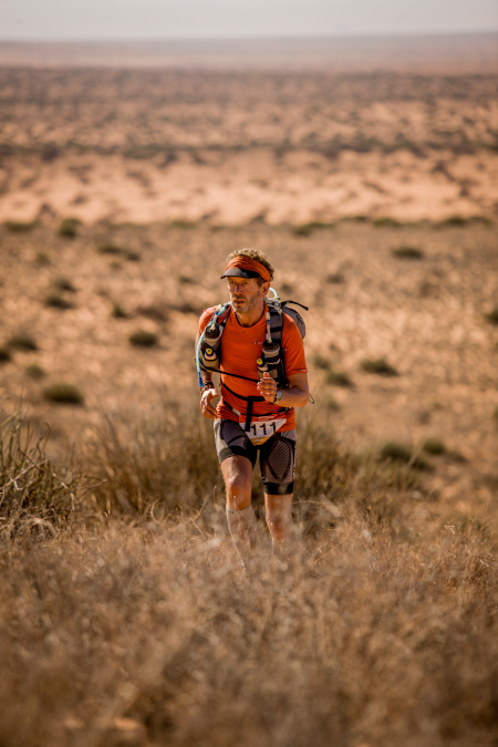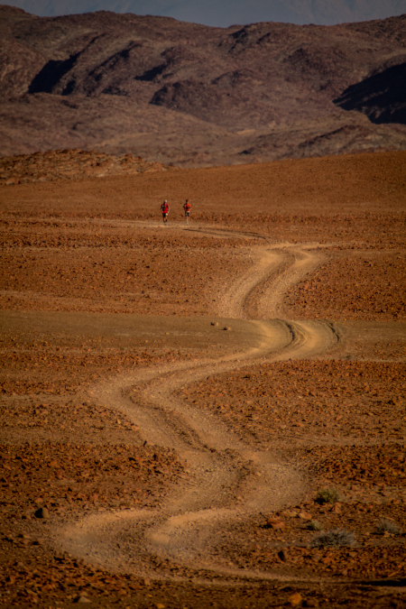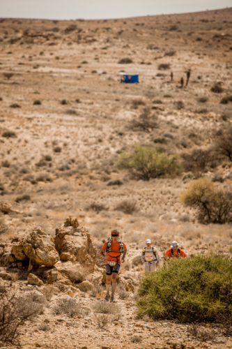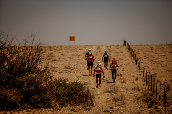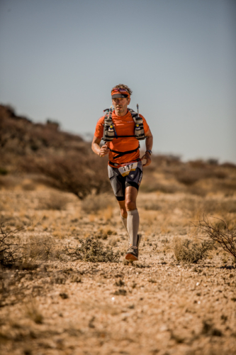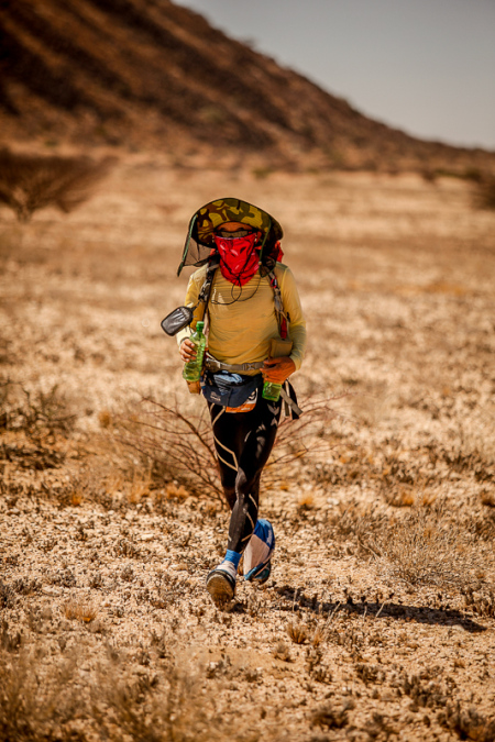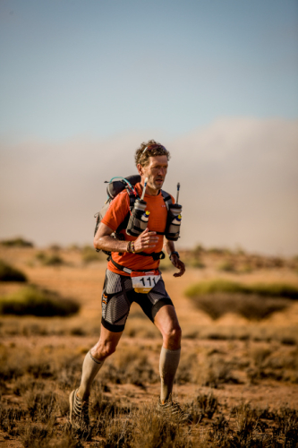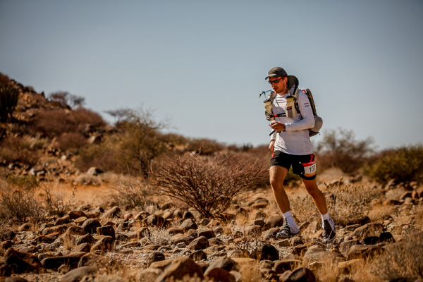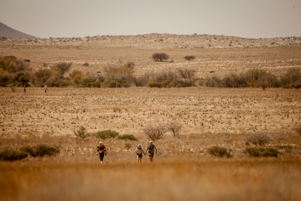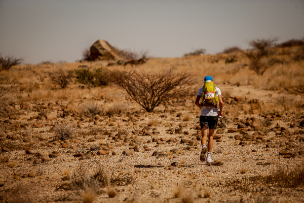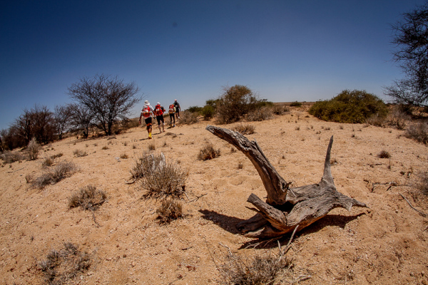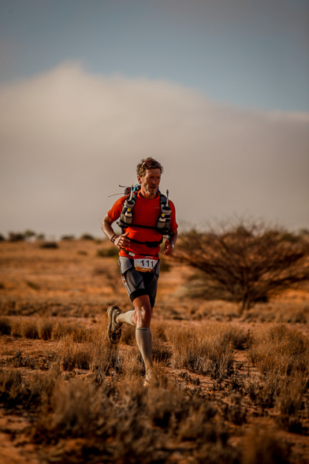 Wir laufen im Geröll, Gestrüpp und gelegentlichen Sandflächen querfeldein. Alan Leed aus Dänemark, der bereits beim Mountain Ultra in den USA auf Platz 4 einlief, macht die Pole. Ich folge und hinter mir läuft Andrew Clarke aus Wales, der in Angola lebt. Bis dahin alles entspannt und so wollte ich das auch am ersten Tag haben. Bloß keine unnötigen Energieverschwendungen…oder wie ich gerne sage „Don’t kill yourself on the first day!“