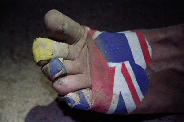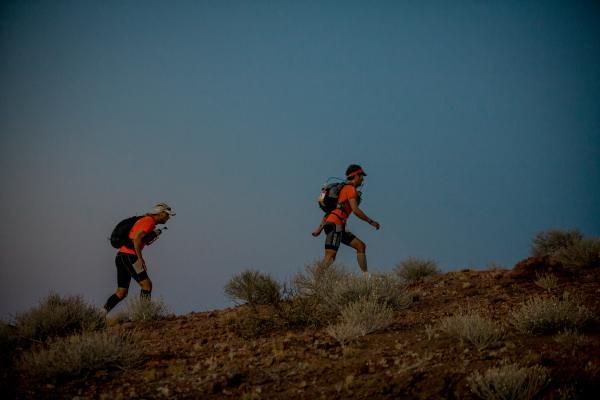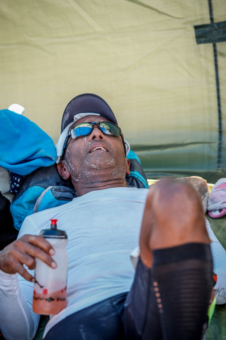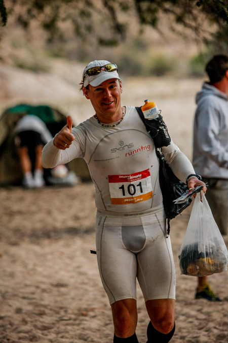 Das Thema Markierungen wird in den darauffolgenden Tagen eindeutig besser. Ich laufe nach 47 km mit 40 Minuten Verspätung auf die beiden Führenden ein. Andrew trifft es an diesem Tag schlimmer. Neil Roche aus Irland geht verloren, wird aber noch am gleichen Tag gefunden. Georg Evetts stürzt so schwer, dass er mit Verdacht auf Armbruch ins Krankenhaus muss. Patrick aus Kanada kommt ins Ziel. Auf dem Weg von der Ziellinie ins Camp sehe ich schon, dass er von Ganzkörperkrämpfen geplagt wird. Ich laufe ihm entgegen, nehme ihm den Rucksack ab. Wir legen ihn hin und unser fabelhaftes Ärzteteam kümmert sich sofort um ihn. Ich bringe ihm meinen Schlafsack und sogar eine Mütze, da sein einsetzender Schüttelfrost Angst macht. Er ist vollkommen dehydriert - trotz Salzaufnahme und viel Wasser während des Rennens hatte er die Härte der Strecke und die Hitze nicht überstanden – wie andere auch. Es werden während der Woche auf der Strecke Werte von 46 Grad gemessen. Der Krankenwagen wird gerufen und bringt auch ihn ins Krankenhaus.
