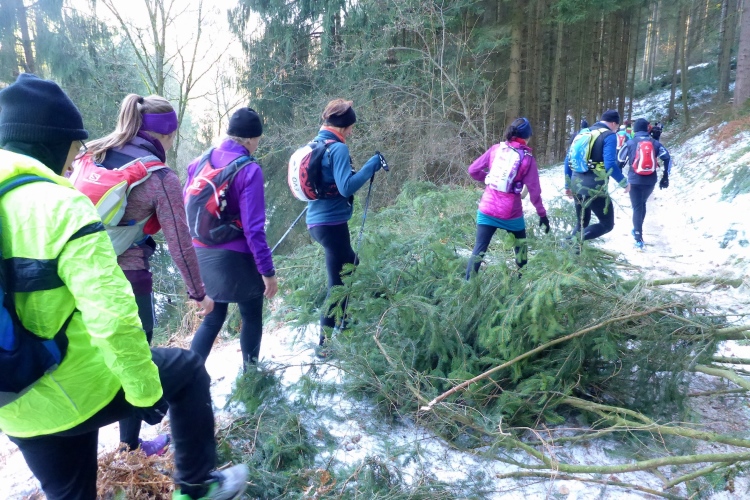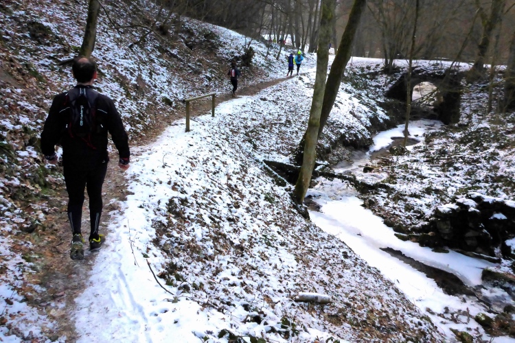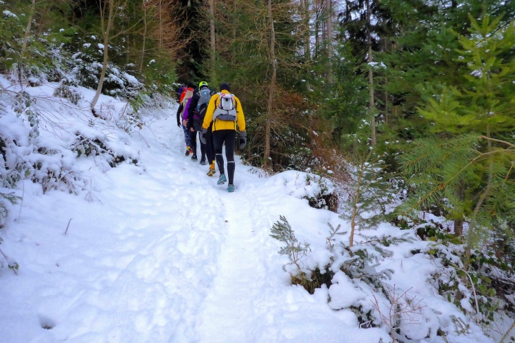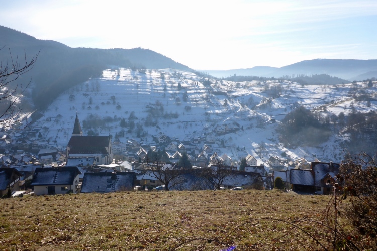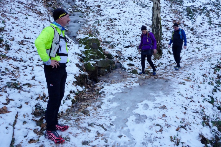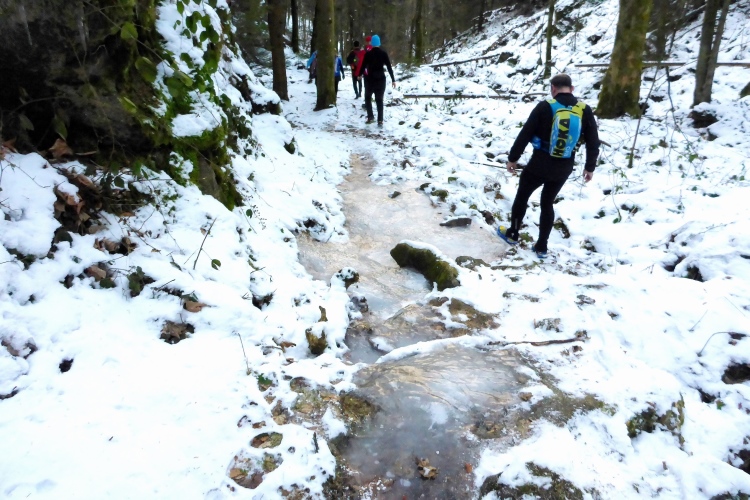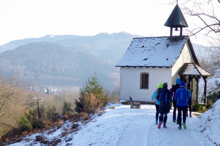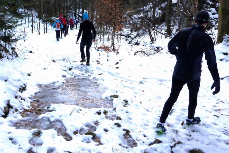 Doch überraschend hilft uns heute der Schnee sogar, diesen Trail relativ leicht zu bewältigen, denn neben den blanken Eisflächen bietet der Schnee genügend stabile Trittstellen. Wir kommen an der Illertkapelle oberhalb von Lautenbach vorbei. Dann geht es hinüber nach Loffenau.