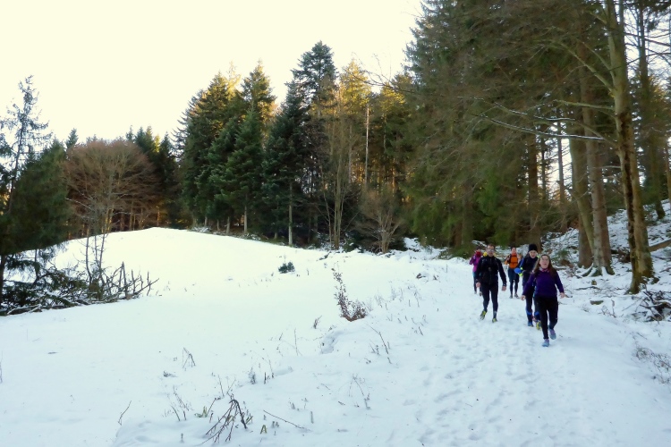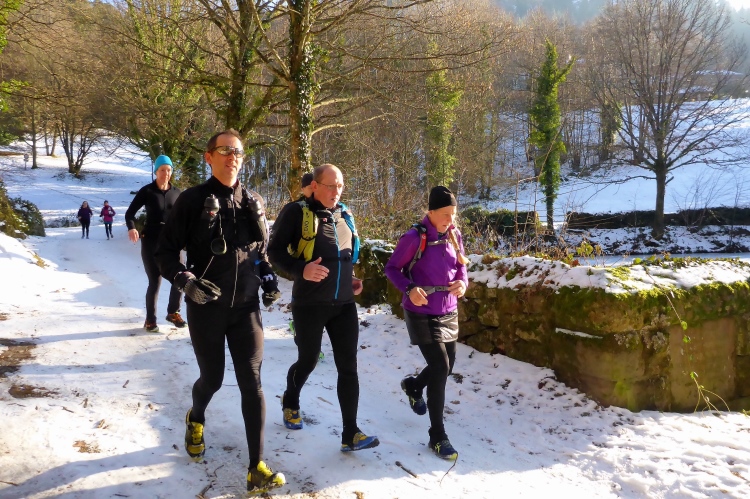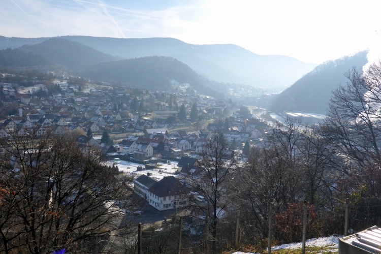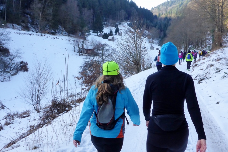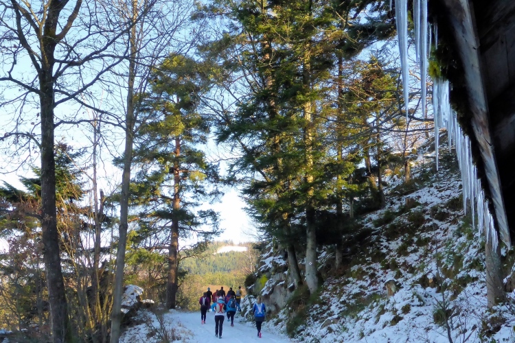 Auf sonnigen Wegen mit Blick zurück zum Schloss und hinab ins Murgtal laufen wir weiter. Der Schnee knirscht unter unseren Schuhen, ist aber meist gut griffig. Nur an einer Stelle im Wald müssen wir etwas aufpassen, als wir bei einer Quelle an einer kleinen Eisfläche vorbei müssen, aber auch das ist kein Problem.