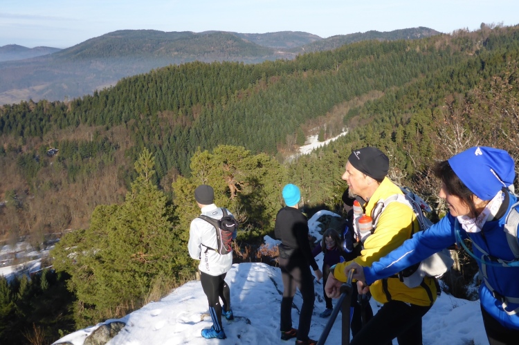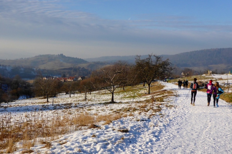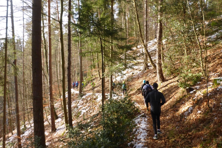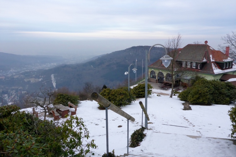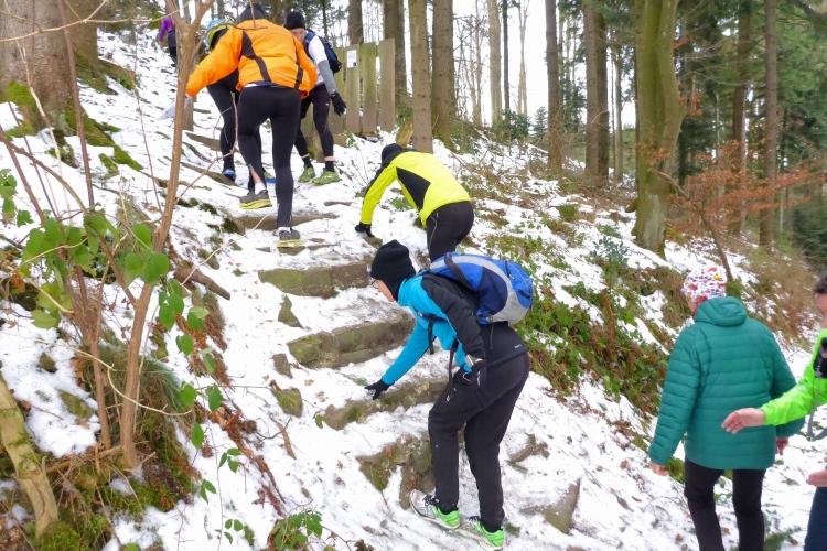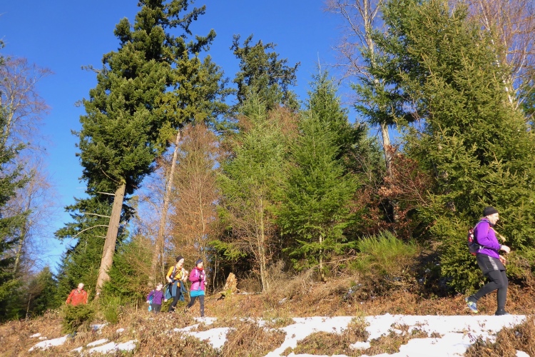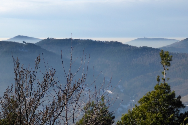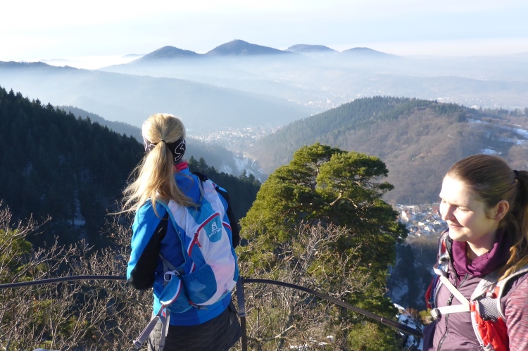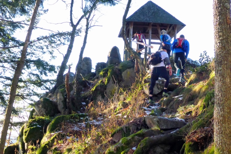 An einigen Stellen muss man etwas wegen Glätte aufpassen, da der tagsüber geschmolzene Schnee in der Nacht wieder gefroren ist, doch insgesamt sind die Streckenverhältnisse heute sehr gut. Nur wenige Meter auf hohen, teilweise vereisten Stufen direkt unterhalb des Gipfels fordern gute Aufmerksamkeit, aber auch das schafft jeder mit Hilfe seiner Begleiter. Vom 668 m hohen Merkur blickt man hinüber zu den höchsten Gipfeln des Nordschwarzwalds, hinab nach Baden-Baden und bei klarer Sicht über die Rheinebene bis zu den Bergen des Pfälzer Wald und den Vogesen. Heute liegt unter uns eine starke Dunstschicht und verbirgt die Rheinebene vor unseren Blicken.