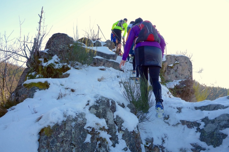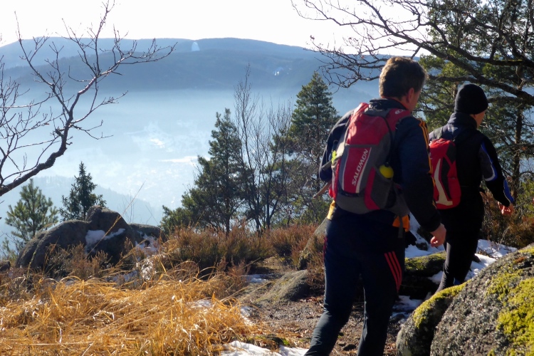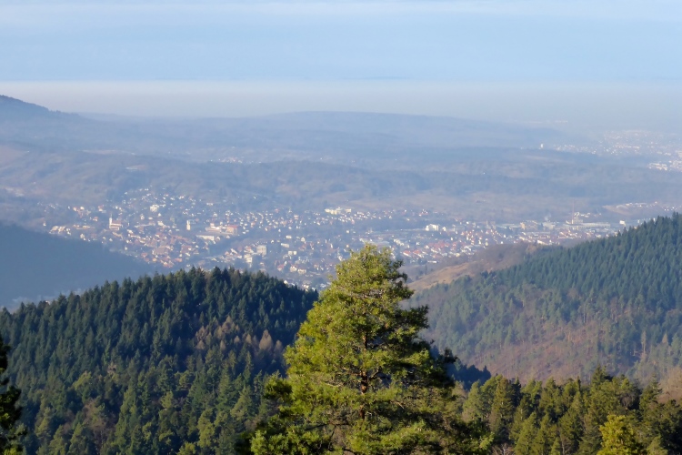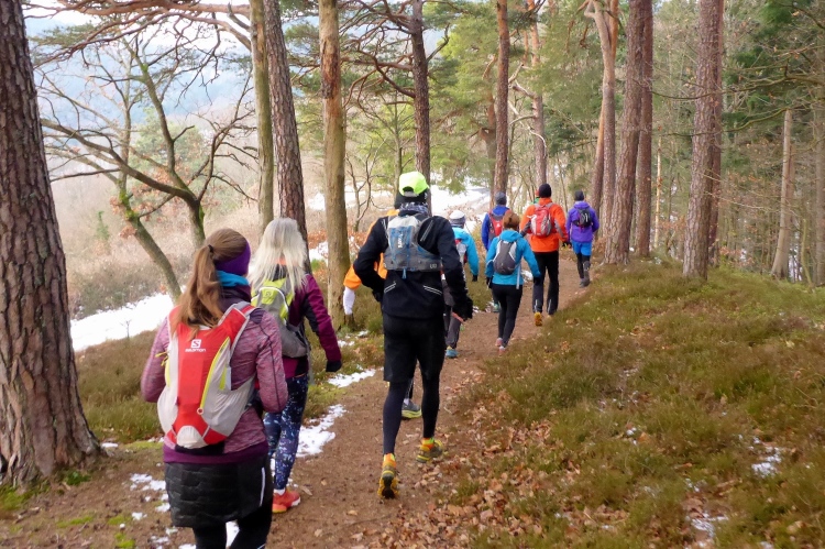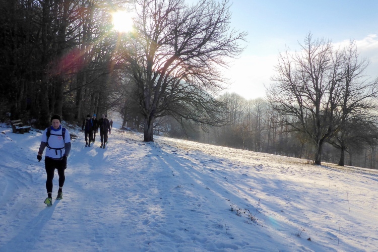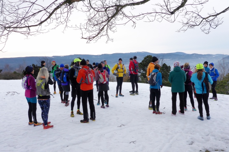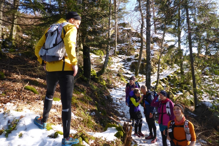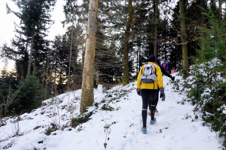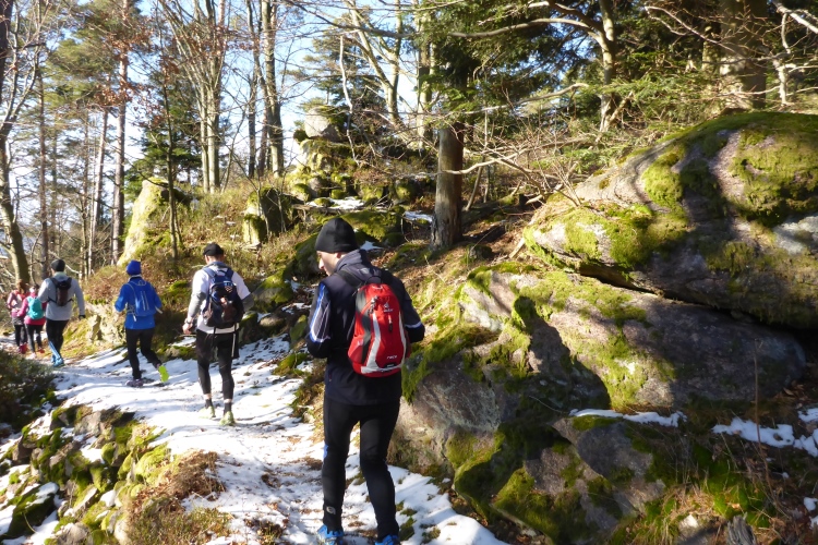 An einigen Stellen muss man etwas wegen Glätte aufpassen, da der tagsüber geschmolzene Schnee in der Nacht wieder gefroren ist, doch insgesamt sind die Streckenverhältnisse heute sehr gut. Nur wenige Meter auf hohen, teilweise vereisten Stufen direkt unterhalb des Gipfels fordern gute Aufmerksamkeit, aber auch das schafft jeder mit Hilfe seiner Begleiter. Vom 668 m hohen Merkur blickt man hinüber zu den höchsten Gipfeln des Nordschwarzwalds, hinab nach Baden-Baden und bei klarer Sicht über die Rheinebene bis zu den Bergen des Pfälzer Wald und den Vogesen. Heute liegt unter uns eine starke Dunstschicht und verbirgt die Rheinebene vor unseren Blicken.
