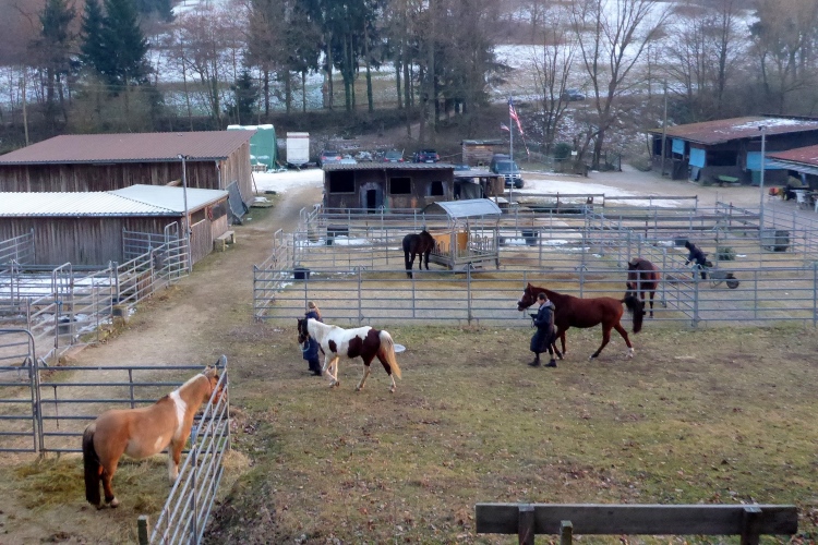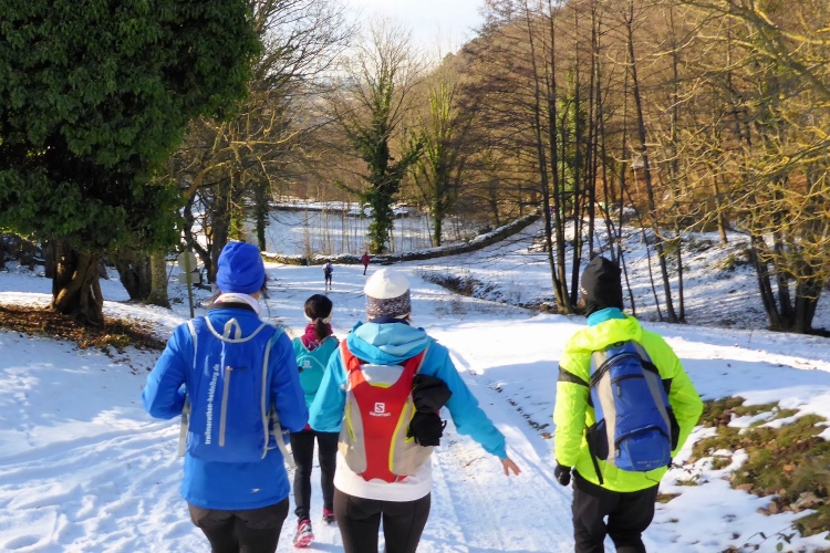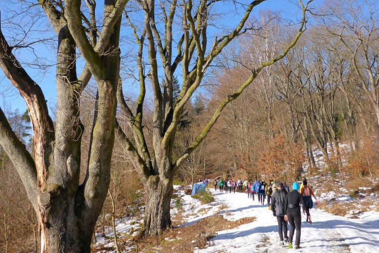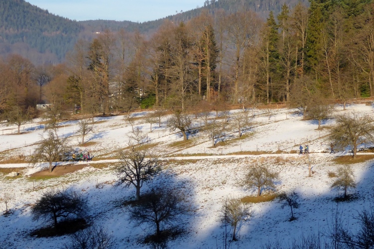 Wir kommen an einer großen Wiese vorbei, wo früher unter großen Eichenbäumen die Schweine zur Waldweide futtern durften. Dann laufen wir über verschneite Wege froh und munter unter tiefblauem, sonnigen Himmel weiter.