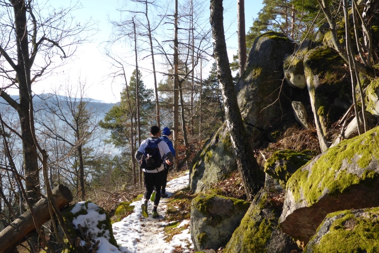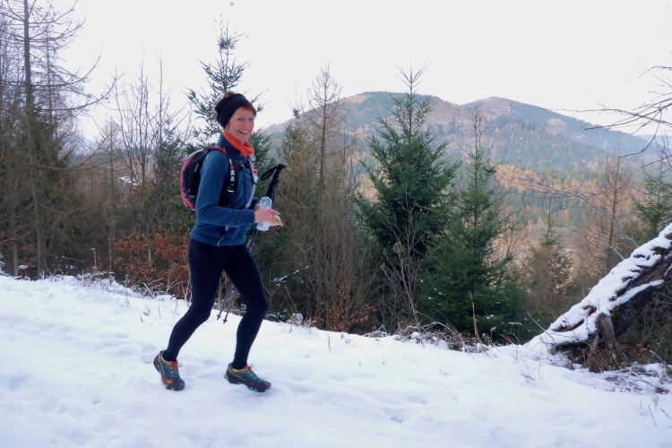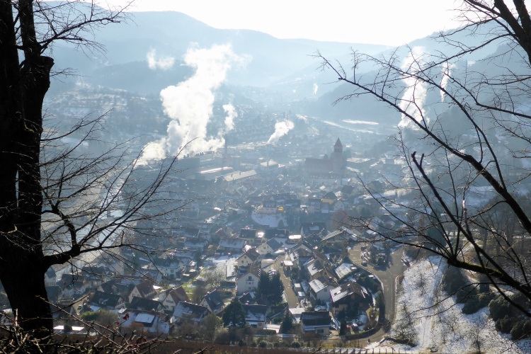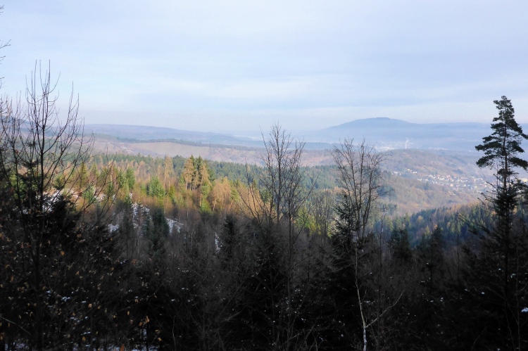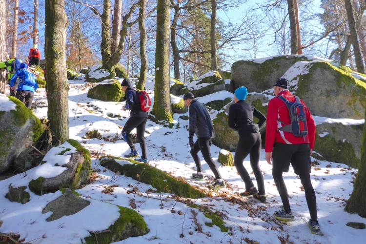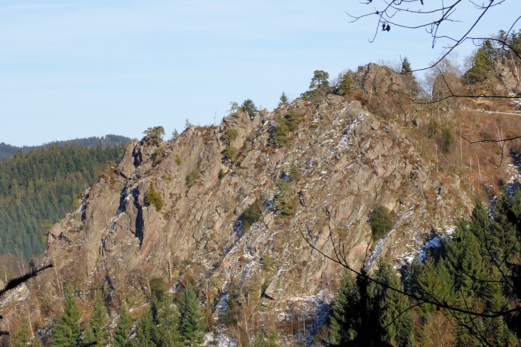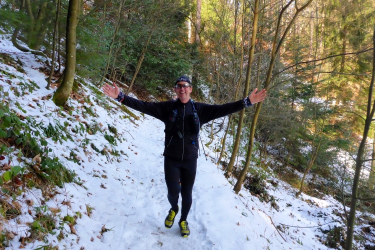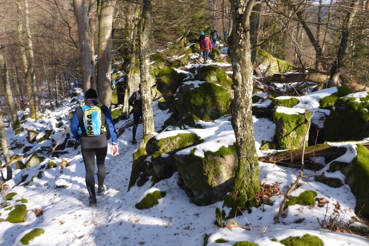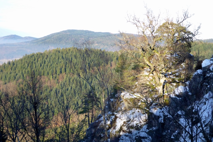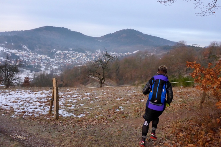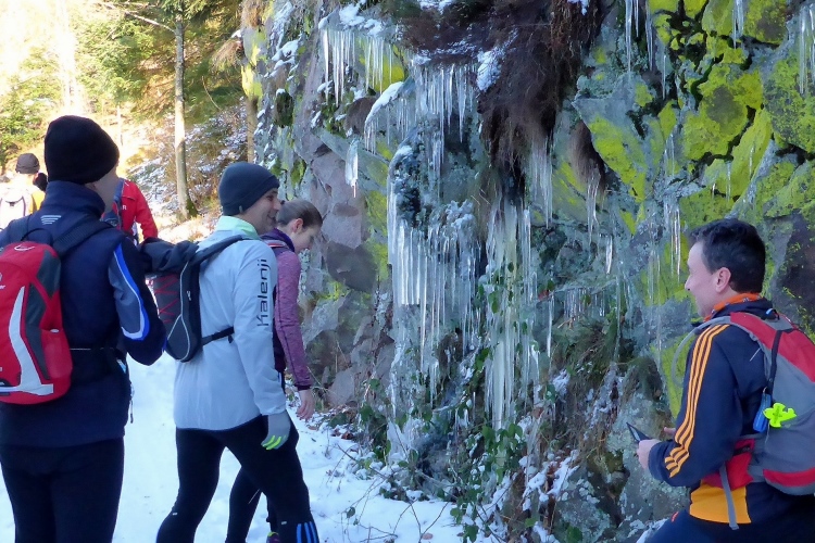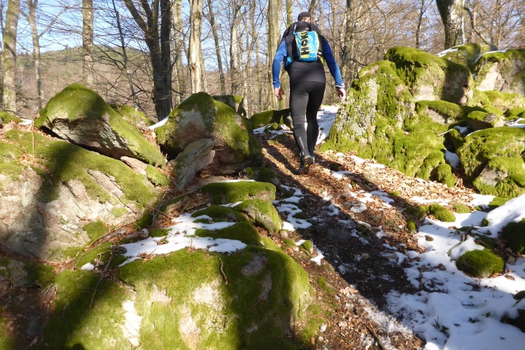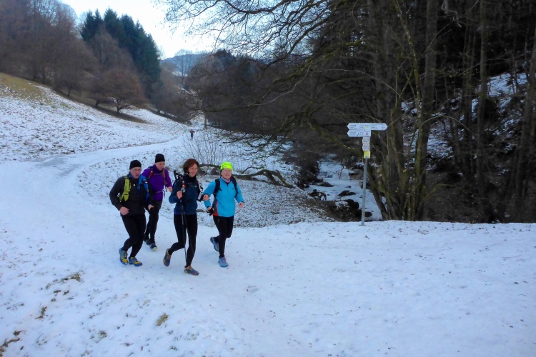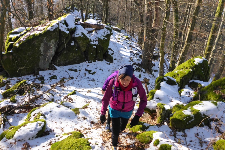 Vom Wanderweg muss man auch hier einige Meter hinauf zu den Felsen kraxeln, aber auch dies ist trotz Schnee und stellenweise Eis heute kein Problem. Oben blicken wir auf Schwarzwaldberge und zur im Dunst kaum erkennbaren Rheinebene. Auf der anderen Seite des Murgtal sehen wir weit entfernt den Merkur, den wir heute Morgen erklommen haben. Auf breiten Wegen geht es leicht durch den Schnee weiter. Ich bin schon gespannt, wie heute der Zustand des steilen Pfades sein wird, der von der Ahornwiese durch das Steintal nach Lautenbach führt. Ich liebe es normalerweise, diesen ruppigen Trail in Kamikazetempo bergab zu rennen, nach dieser sehr kalten Woche ist aber klar, dass wir hier auf vereiste Abschnitte treffen werden.
