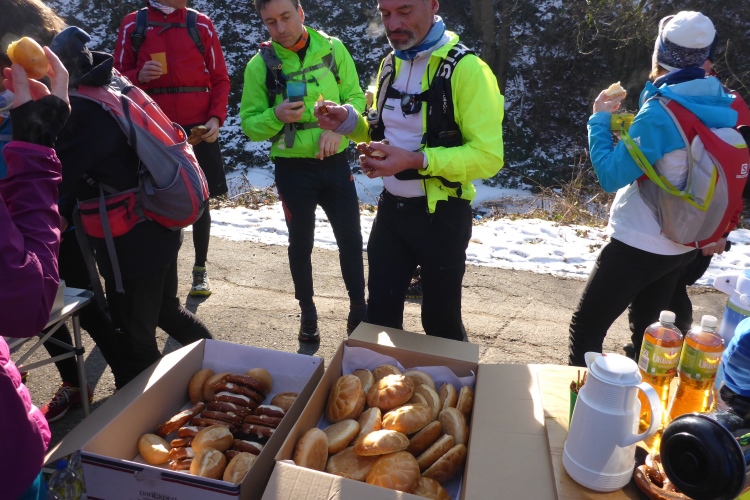 Bei Hilpertsau sehen wir unter uns große Papierfabriken. Dann überqueren wir auf einer Werksbrücke die Murg und erreichen unsere erste Verpflegungsstelle. Friedbert und Brigitte Fellmoser versorgen uns Läufer hier schon seit Jahren auf eigene Kosten mit einer sehr guten Auswahl an Getränken und Speisen für jeden Geschmack. Dazu gibt es vom Bürgermeister gespendetes Hefegebäck in Form der durch die Wegmarkierung bekannten Ebersteinrose. Diese Verpflegungsstelle ist viel besser ausgestattet als die VPs bei manchen teuren Großveranstaltungen. Vielen Dank! In den letzten Jahren nutzten einige Läufer die Gelegenheit, von hier aus mit der Bahn zurück zu fahren. Doch bei diesem herrlichen Wetter will auch Susanne, die mangels Training heute eigentlich nur die halbe Runde laufen wollte, weiter bei uns bleiben. Das freut uns sehr.