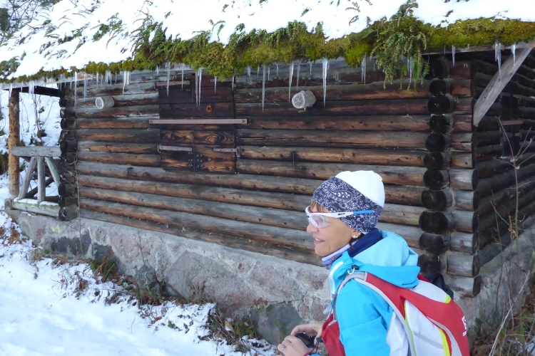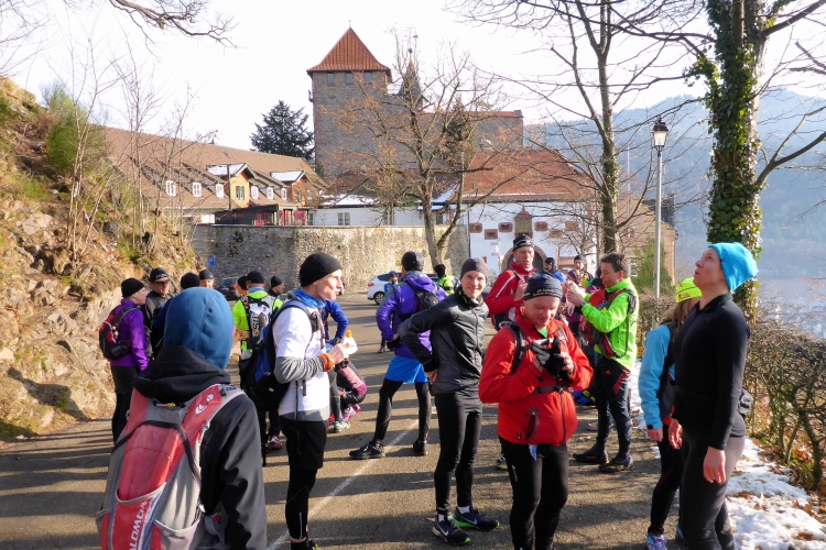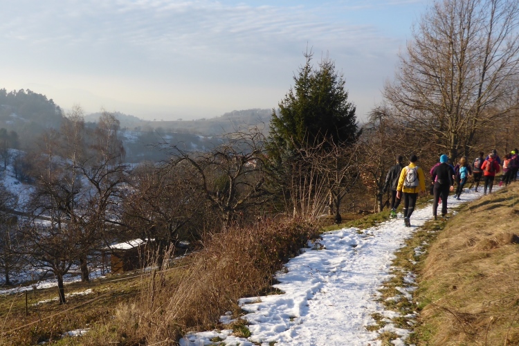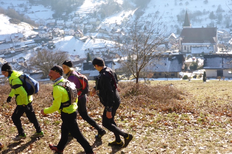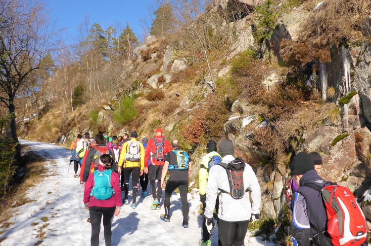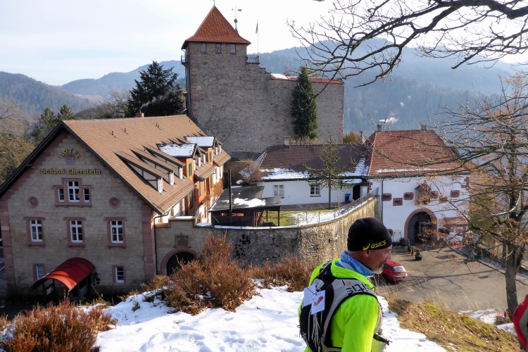 Mal auf breiten Wegen, mal auf schönen Pfaden, meist über Schnee geht es problemlos und ohne allzu viele Höhenunterschiede weiter. Ach, macht das Laufen bei diesem herrlichen Wetter und mit so vielen Freunden Spaß! Vor Schloss Eberstein verlassen wir kurz die Gernsbacher Runde, um über den Sagenweg zu einem kleinen Aussichtspunkt oberhalb des Schlosses zu laufen. Das Schloss wurde im 13. JH Stammsitz des Grafen von Eberstein erbaut. Bis vor einigen Jahren gehörte es dem Markgrafen von Baden, der es aber wegen finanzieller Probleme im Jahr 2000 verkaufen musste. Heute sind darin ein Gourmet-Restaurant sowie die auch für normale Wanderer geeignete Schlossschänke. Auch das kleine Weingut erlebt nun einen neuen Aufschwung.