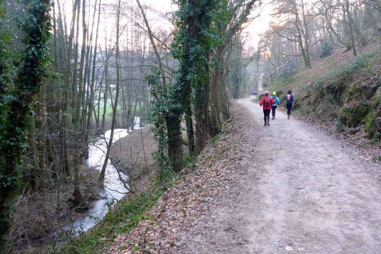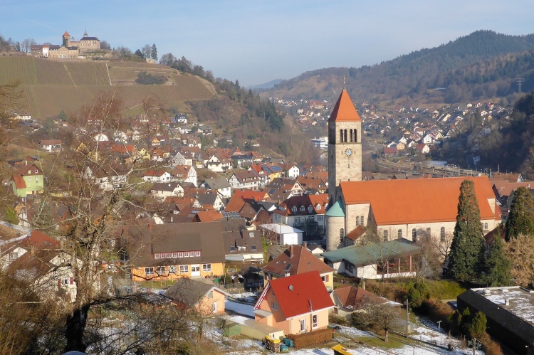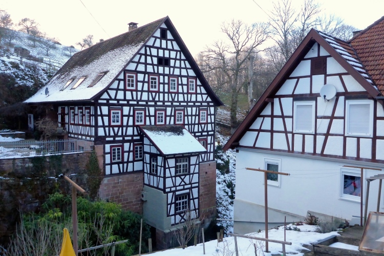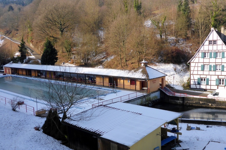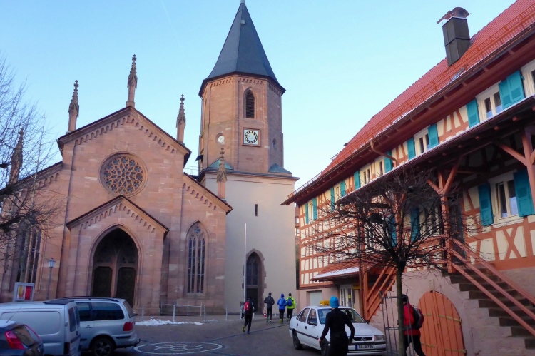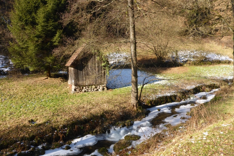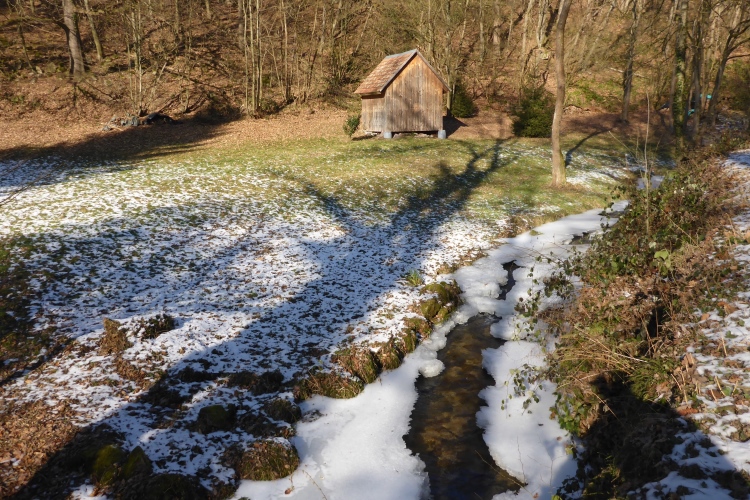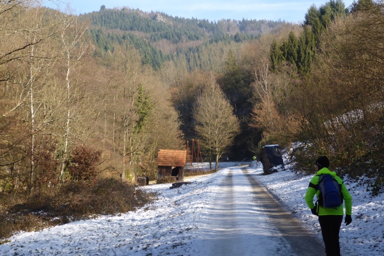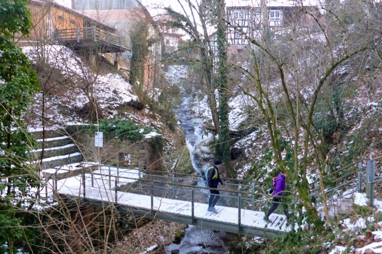 Nun heißt es raus in die Kälte. Doch so kalt ist es jetzt gar nicht mehr. Den Temperaturschock nach dieser netten Pause kenne ich von früheren Jahren viel krasser. Vorbei an der Kirche von Loffenau und einigen Fachwerkhäusern geht es zu dem kleinen Wasserfall, wo sich der Laufbach in den Sandstein gegraben hat. Weiter unten ist das Laufbachtal dann breiter und wir wissen, dass unsere Tour allmählich zu Ende geht.
